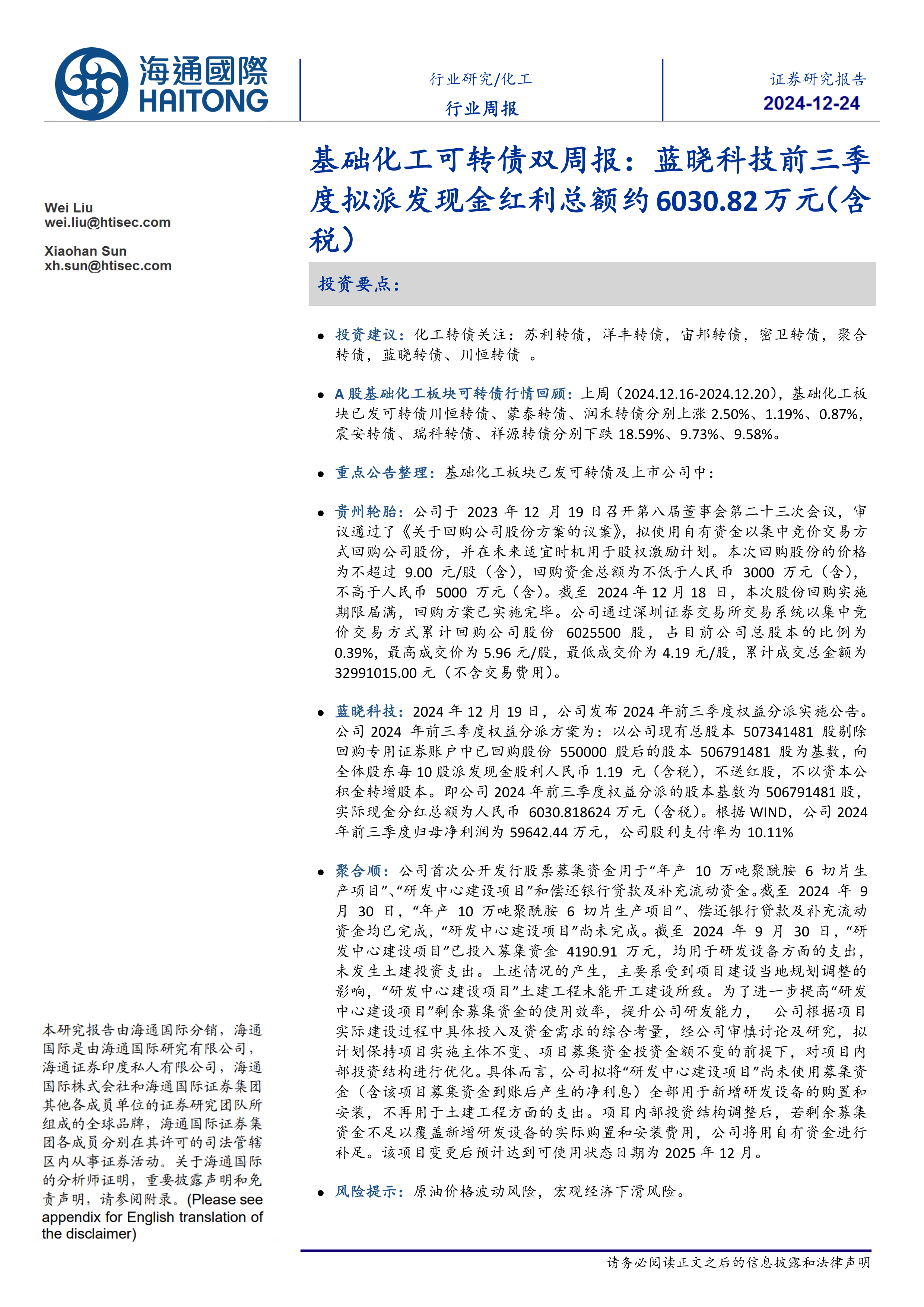 基础化工可转债双周报:蓝晓科技前三季度拟派发现金红利总额约6030.82万元(含税)