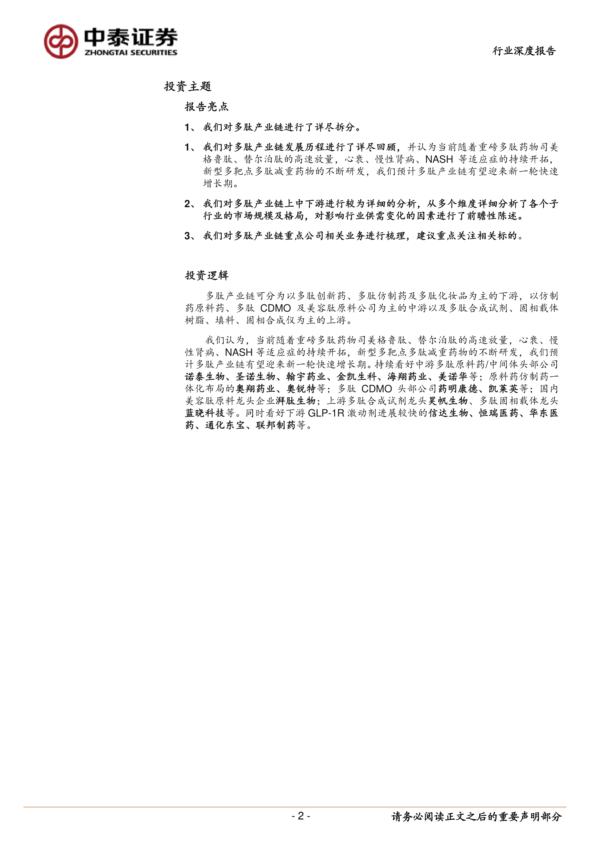 本报告的核心观点是:多肽产业链,特别是中上游,由于多重因素驱动下游需求旺盛,有望迎来快速增长期。 具体而言,下游需求增长主要源于GLP-1激动剂在减重等新适应症的持续放量、研发管线的持续扩容以及多个重磅多肽品种专利到期带来的仿制药机遇;中游的高生产壁垒保证了较好的市场格局,将直接受益于下游的高速增长;上游的合成试剂、固相载体等材料也将率先受益于下游需求的扩张。 报告建议投资者重点关注中上游的多肽原料药/中间体公司、多肽CDMO公司、美容肽原料公司以及多肽合成试剂和固相载体龙头企业。