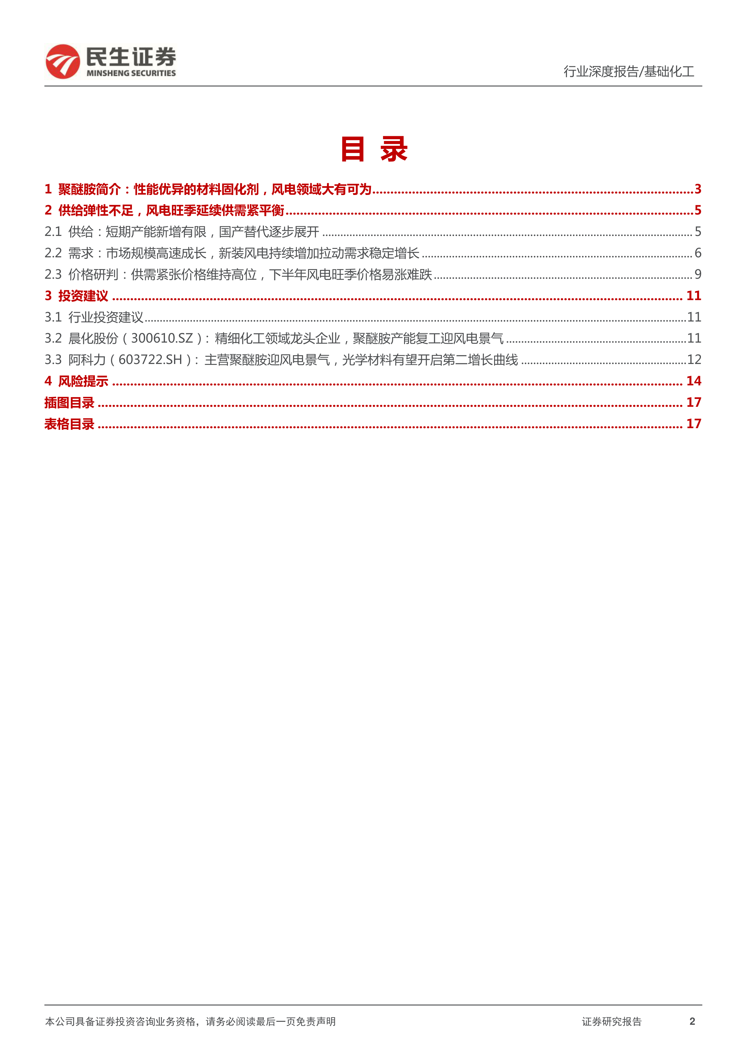 风险提示: (1)新增产能快速投放的风险。目前国内规划与在建产能较多,如短期内在建产能加速投放,或将扭转供需关系逐步走向宽松。(2)需求不及预期的风险。聚醚胺的风电领域需求取决于风电新装机量,若 2022 下半年装机量不及预期将导致聚醚胺需求增速下滑。此外,当前疫情形势存在对聚醚胺非风电需求的不确定因素,建筑及工业领域需求增速或存在下降风险。