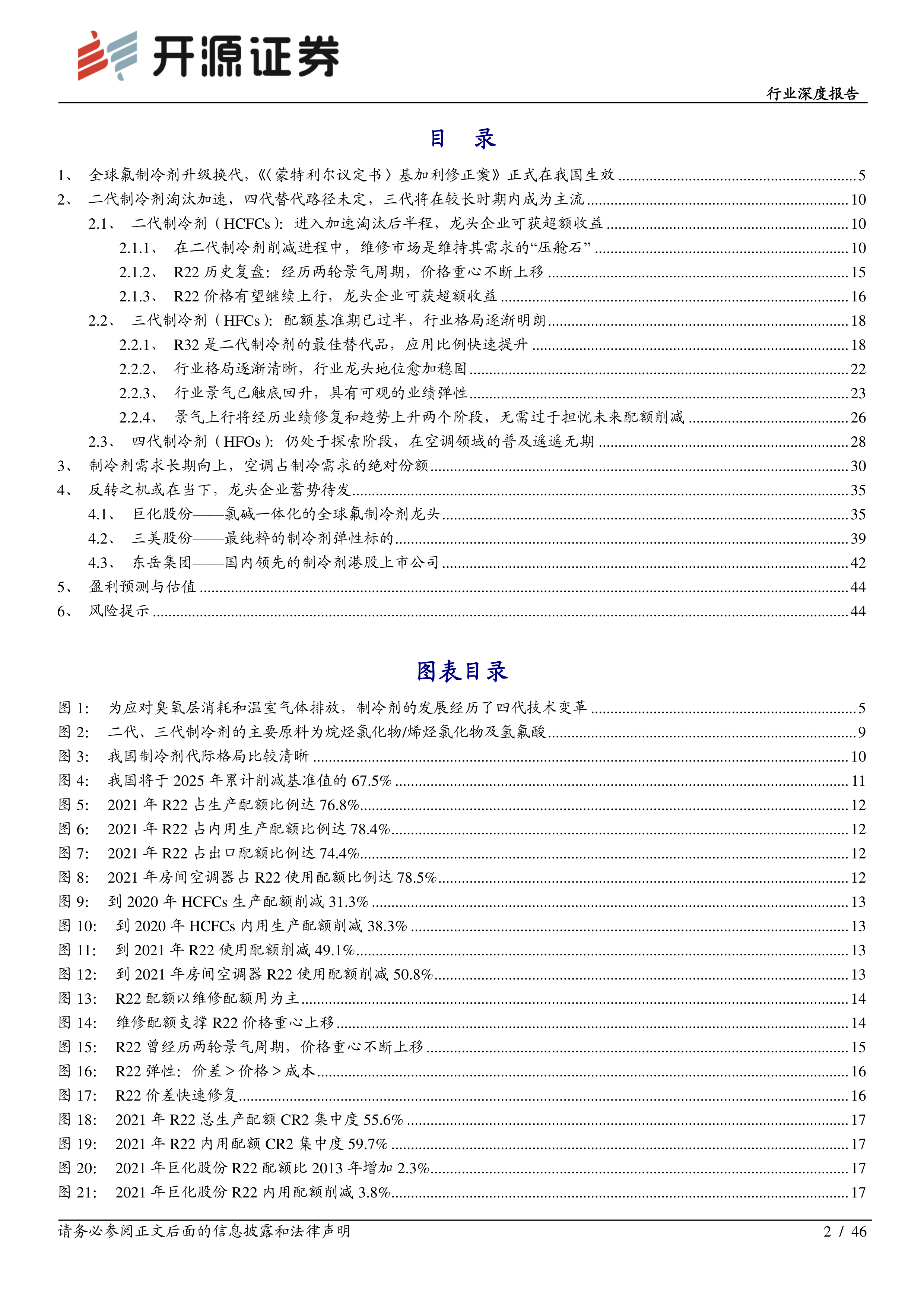 2021 年 6 月 17 日,中国常驻联合国代表团向联合国秘书长交存了中国政府接受《〈关于消耗臭氧层物质的蒙特利尔议定书〉基加利修正案》的接受书,该修正案已于 2021 年 9 月 15 日对我国生效。 2021 年 9 月 30 日,我国生态环境部发布《关于严格控制第一批氢氟碳化物化工生产建设项目的通知(征求意见稿)》,其中要求,各地不得新建、扩建用作制冷剂、发泡剂等受控用途的 R32、 R134a、R125、 R143a 和 R245fa 化工生产设施。 我国对 HFCs 制冷剂的管控政策已逐步落地。在政策预期愈发明朗的情况下,行业景气度将逐渐回暖。近期,由于受“双控双限”政策影响,部分地区中小制冷剂企业开工不足,对本就在配额争夺中处于劣势的中小企业冲击较大,但却缓解了因配额争夺导致的竞争加剧,进而造成行业产能过剩的局面。我们认为,随着配额基准期已过半、政策的逐步落地,又受“双控双限”的催化, 制冷剂行业景气拐点或已提前到来。