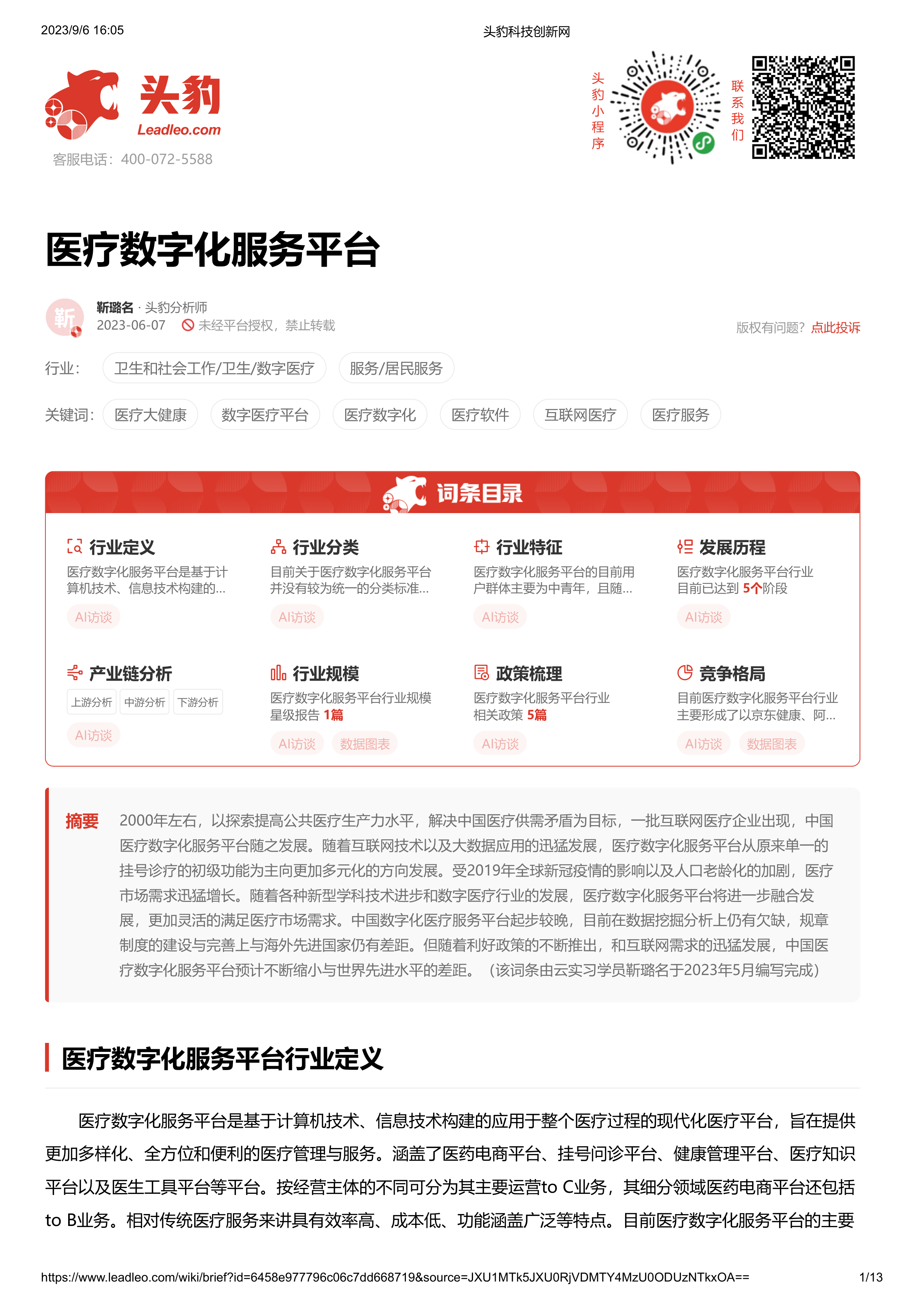 本报告基于头豹研究院对中国医疗数字化服务平台的分析,核心观点如下: