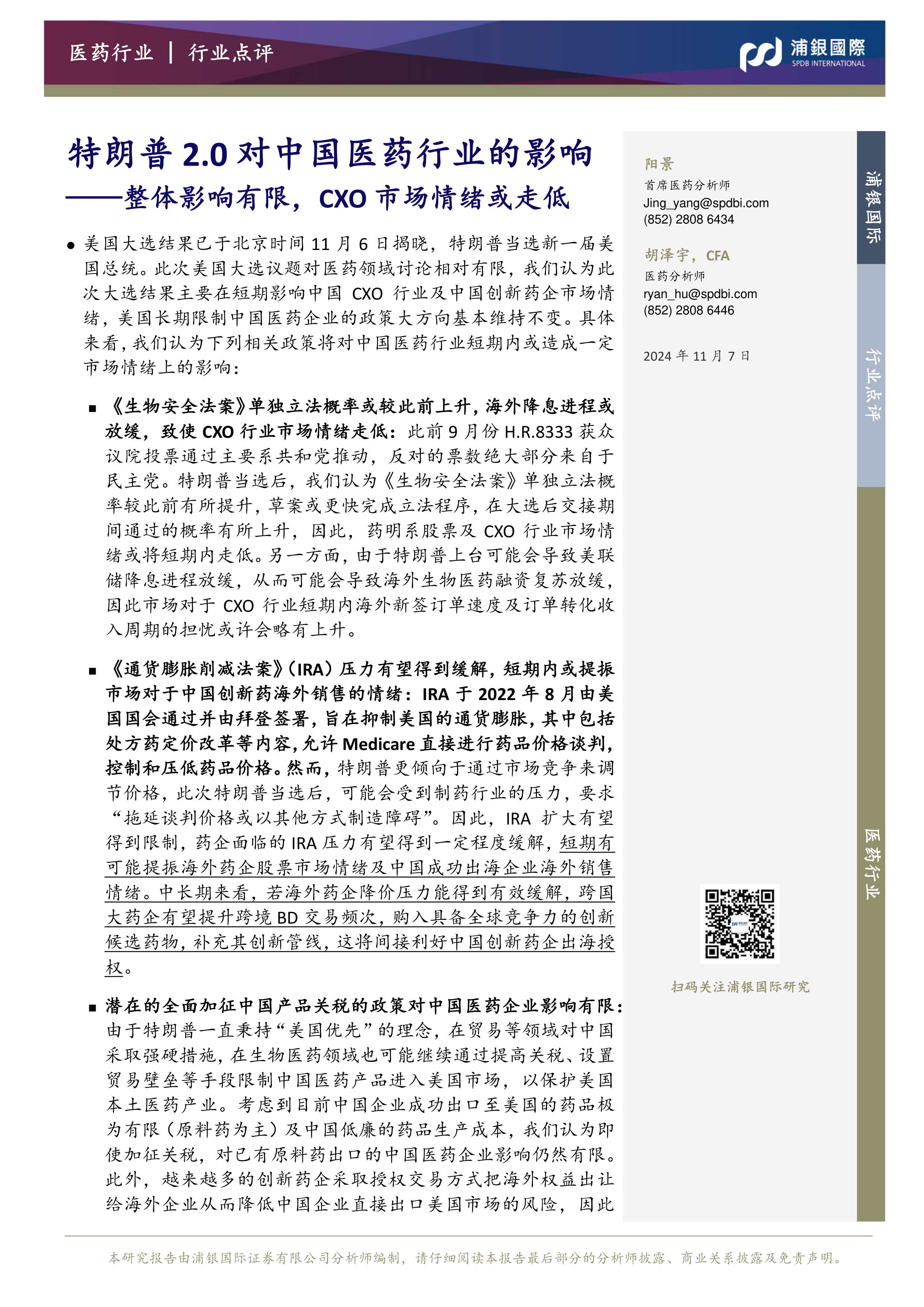 本报告的核心观点是:特朗普当选美国总统对中国医药行业的影响总体有限,但短期内可能对CXO行业和中国创新药企的市场情绪造成一定波动。具体而言,其影响主要体现在以下几个方面: