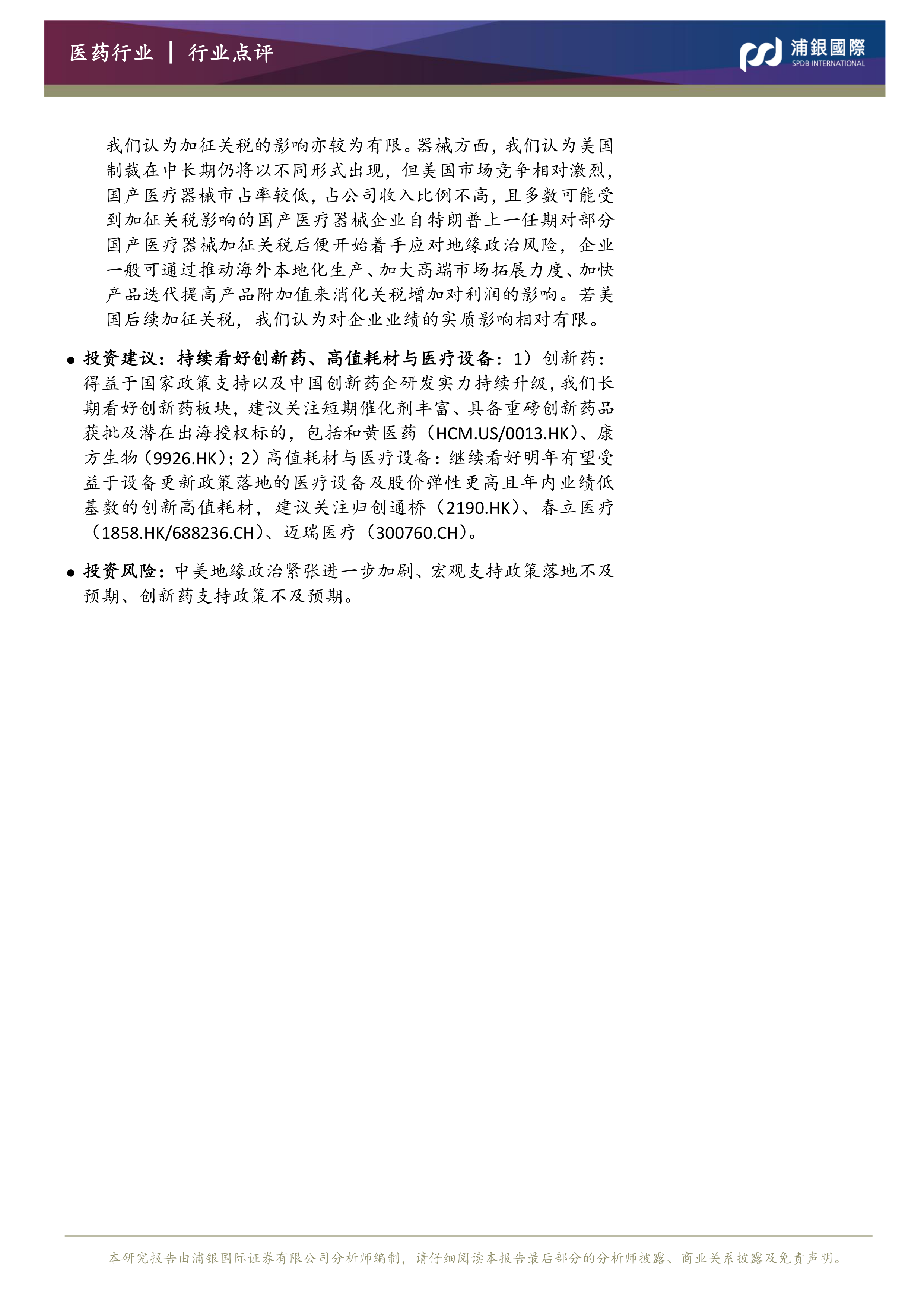 潜在的全面加征中国产品关税的政策对中国医药企业影响有限:由于特朗普一直秉持“美国优先”的理念,在贸易等领域对中国采取强硬措施,在生物医药领域也可能继续通过提高关税、设置贸易壁垒等手段限制中国医药产品进入美国市场,以保护美国本土医药产业。考虑到目前中国企业成功出口至美国的药品极为有限(原料药为主)及中国低廉的药品生产成本,我们认为即使加征关税,对已有原料药出口的中国医药企业影响仍然有限。此外,越来越多的创新药企采取授权交易方式把海外权益出让给海外企业从而降低中国企业直接出口美国市场的风险,因此我们认为加征关税的影响亦较为有限。器械方面,我们认为美国制裁在中长期仍将以不同形式出现,但美国市场竞争相对激烈,国产医疗器械市占率较低,占公司收入比例不高,且多数可能受到加征关税影响的国产医疗器械企业自特朗普上一任期对部分国产医疗器械加征关税后便开始着手应对地缘政治风险,企业一般可通过推动海外本地化生产、加大高端市场拓展力度、加快产品迭代提高产品附加值来消化关税增加对利润的影响。若美国后续加征关税,我们认为对企业业绩的实质影响相对有限。