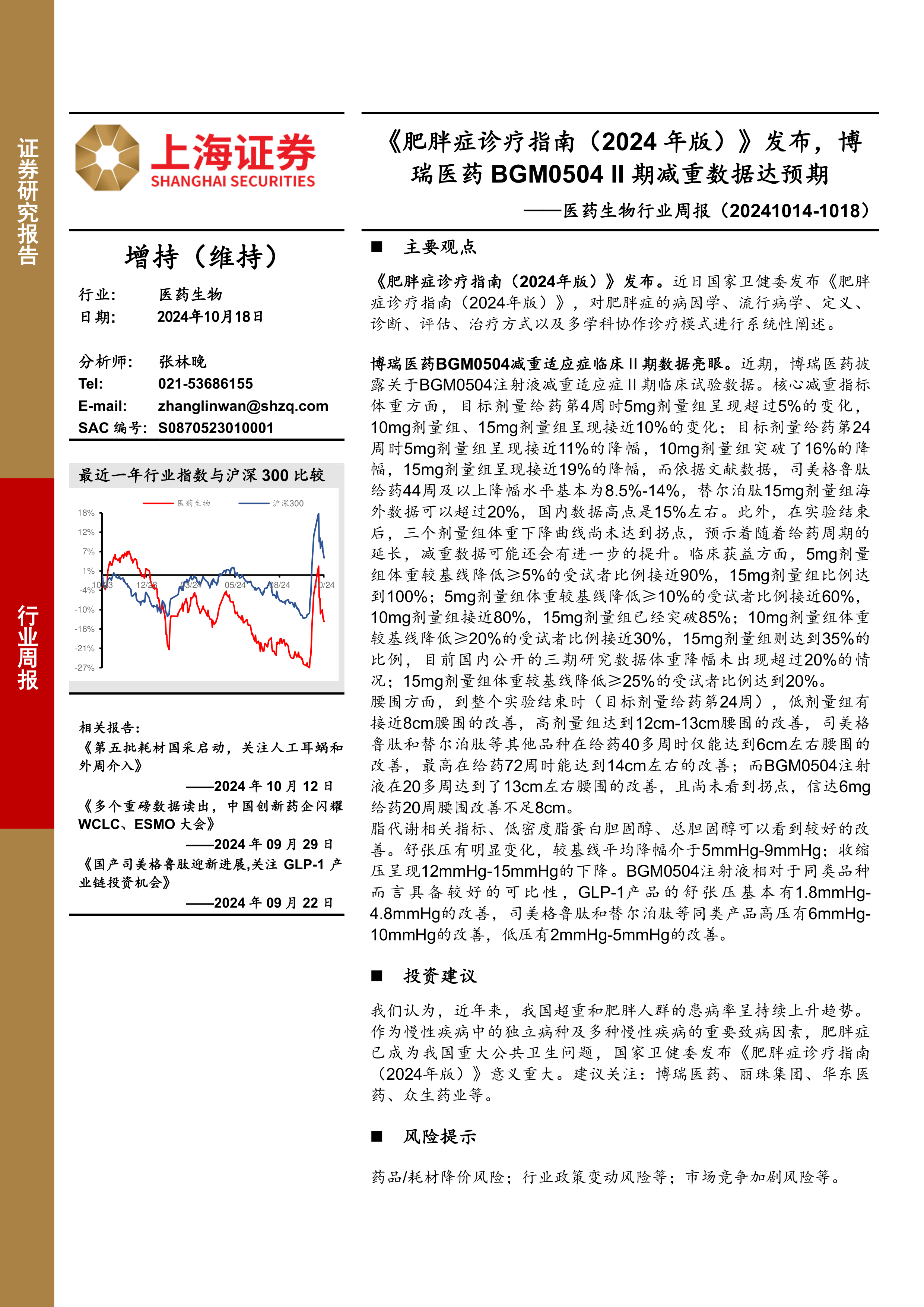 医药生物行业周报:《肥胖症诊疗指南(2024年版)》发布,博瑞医药BGM0504 II期减重数据达预期