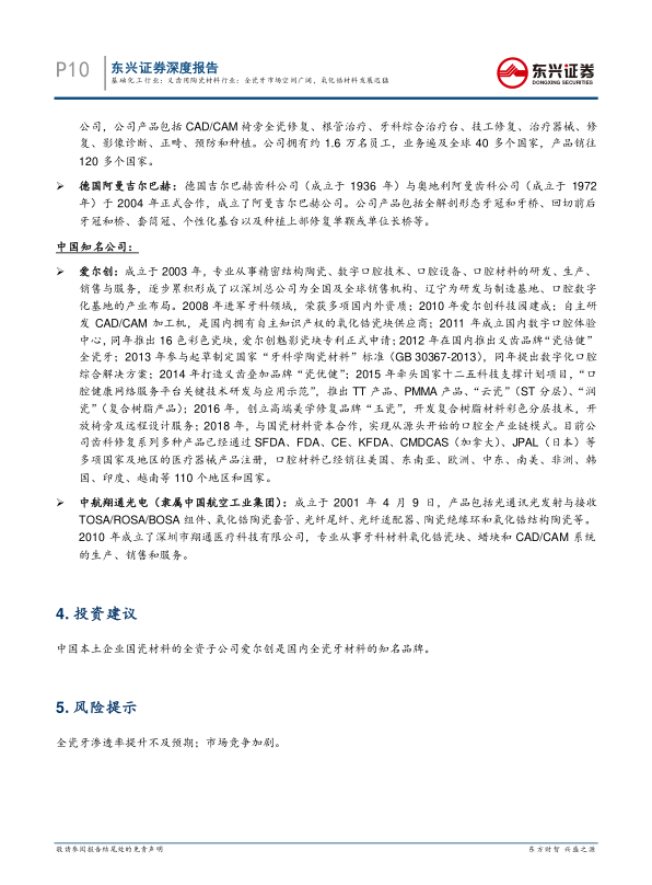 报告最后给出了投资建议,看好国瓷材料(爱尔创母公司)的投资价值,并指出了全瓷牙渗透率提升不及预期和市场竞争加剧等潜在风险。