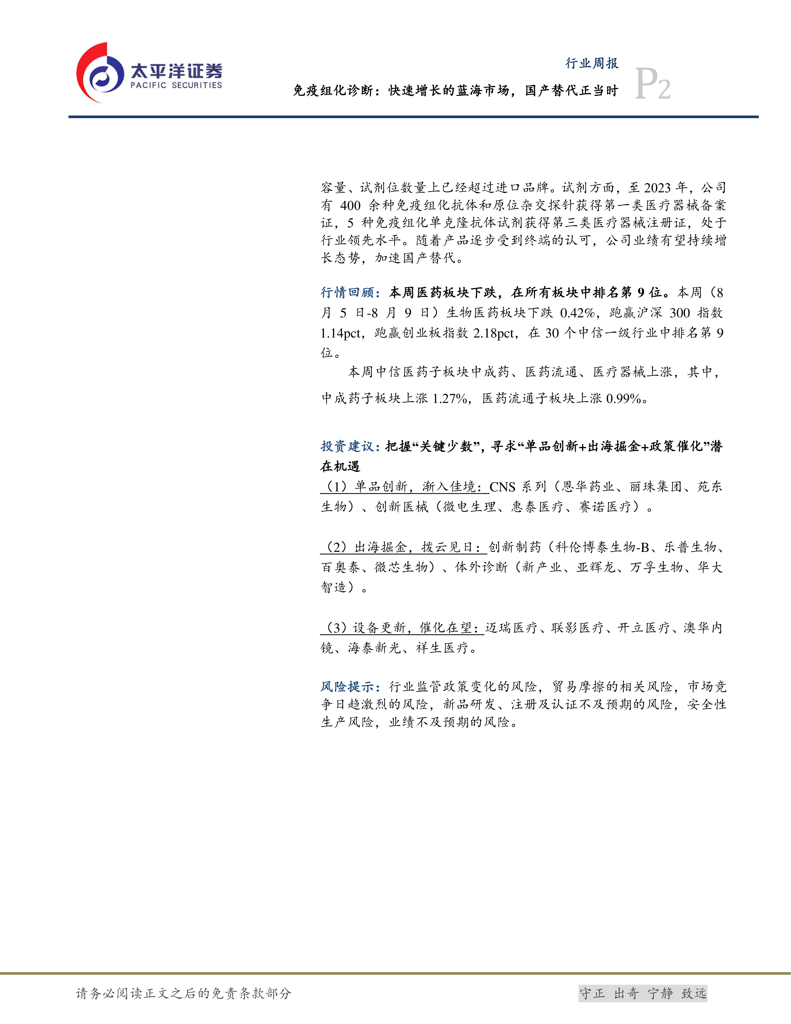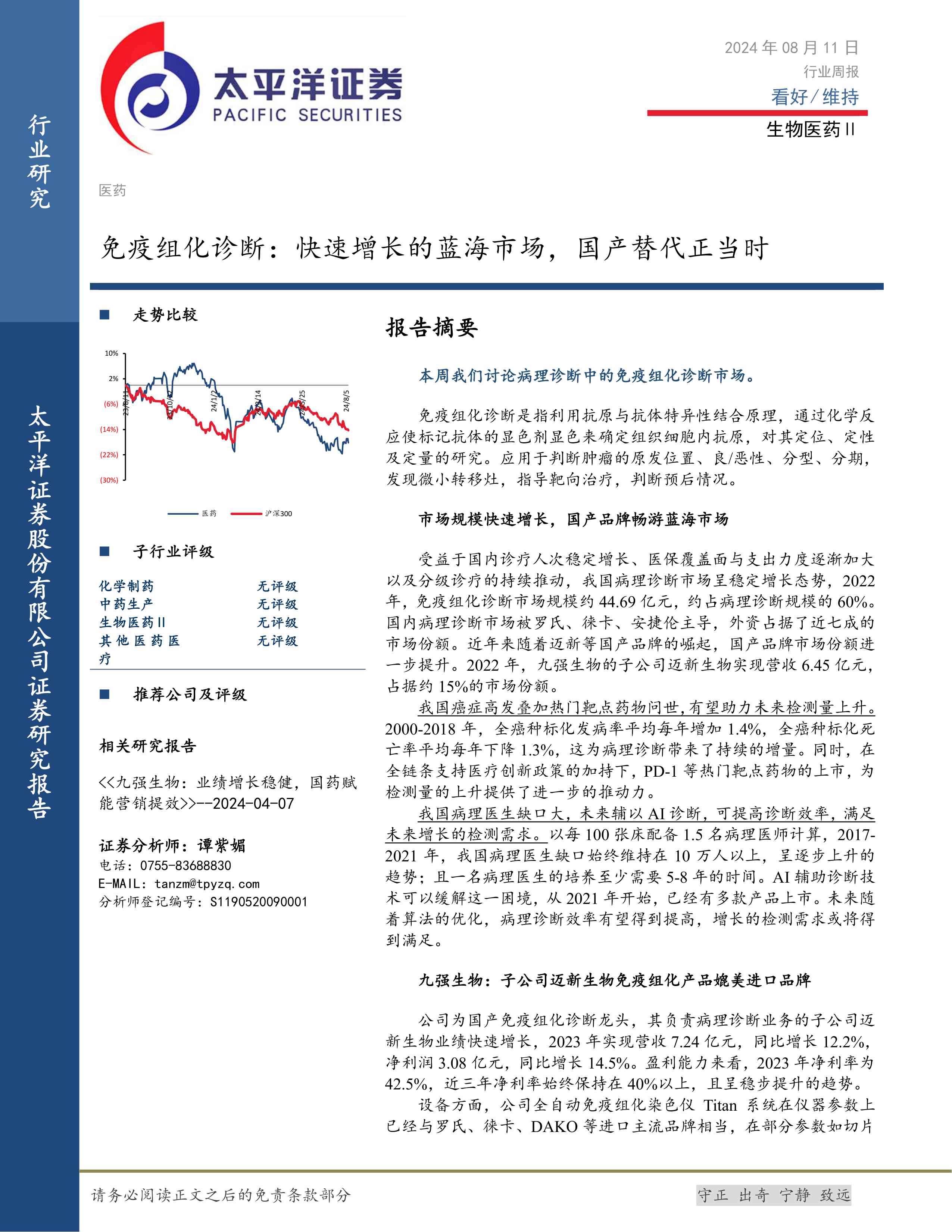 本报告深入分析了免疫组化诊断市场的现状和未来发展趋势,指出该市场规模快速增长,国产替代空间巨大。九强生物子公司迈新生物作为国产龙头企业,凭借其强大的产品竞争力和市场地位,有望在国产替代浪潮中持续受益。报告还对医药行业整体走势和投资机会进行了分析,为投资者提供了参考信息。 报告同时提示了行业监管政策变化、贸易摩擦、市场竞争加剧以及产品研发风险等潜在风险。
