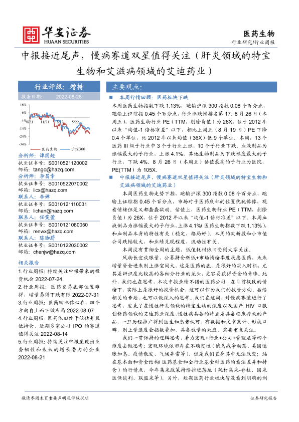 本报告的核心观点是:尽管本周医药生物板块整体表现疲软,跑输大盘,但中报业绩接近尾声,部分细分领域,特别是慢病赛道,展现出良好的投资机会。报告建议关注估值处于历史低位的医药公司,特别是业绩优良且具备较高辨识度的龙头企业,以及在慢性病领域具有临床疗效和市场潜力的公司,例如肝炎领域的特宝生物和艾滋病领域的艾迪药业。 报告同时提供了华安证券八月月度“华安医药十二票”以及全年投资方向配置建议,并对部分公司进行了深度分析。