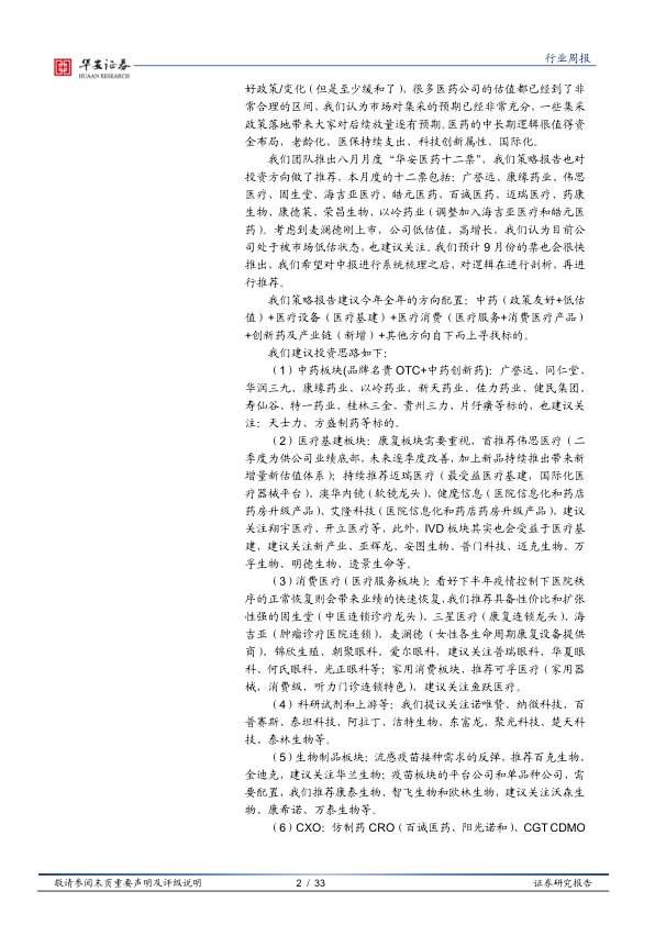 我们团队推出八月月度“华安医药十二票”,我们策略报告也对投资方向做了推荐,本月度的十二票包括:广誉远、康缘药业、伟思医疗、固生堂、海吉亚医疗、皓元医药、百诚医药、迈瑞医疗、药康生物、康德莱、荣昌生物、以岭药业(调整加入海吉亚医疗和皓元医药)。考虑到麦澜德刚上市,公司低估值、高增长,我们认为目前公司处于被市场低估状态,也建议关注。我们预计 9 月份的票也会很快推出,我们希望对中报进行系统梳理之后,对逻辑在进行剖析,再进行推荐。我们策略报告建议今年全年的方向配置:中药(政策友好+低估值) +医疗设备(医疗基建) +医疗消费(医疗服务+消费医疗产品)+创新药及产业链(新增) +其他方向自下而上寻找标的。我们建议投资思路如下: