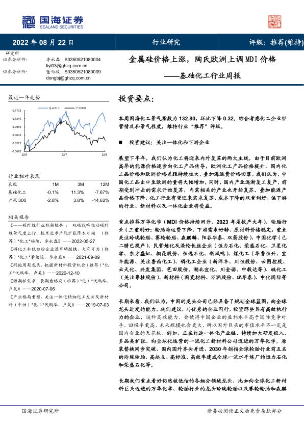 本周国海化工景气指数为132.80,环比下降0.32。综合考虑化工企业经营情况和景气程度,维持行业“推荐”评级。