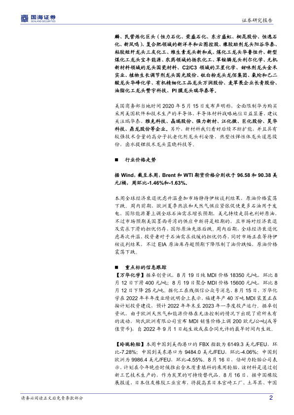 本报告通过对基础化工行业周报数据的分析,跟踪了重点标的公司的信息,并对行业价格走势进行了观察,最后给出了重点关注公司及盈利预测。