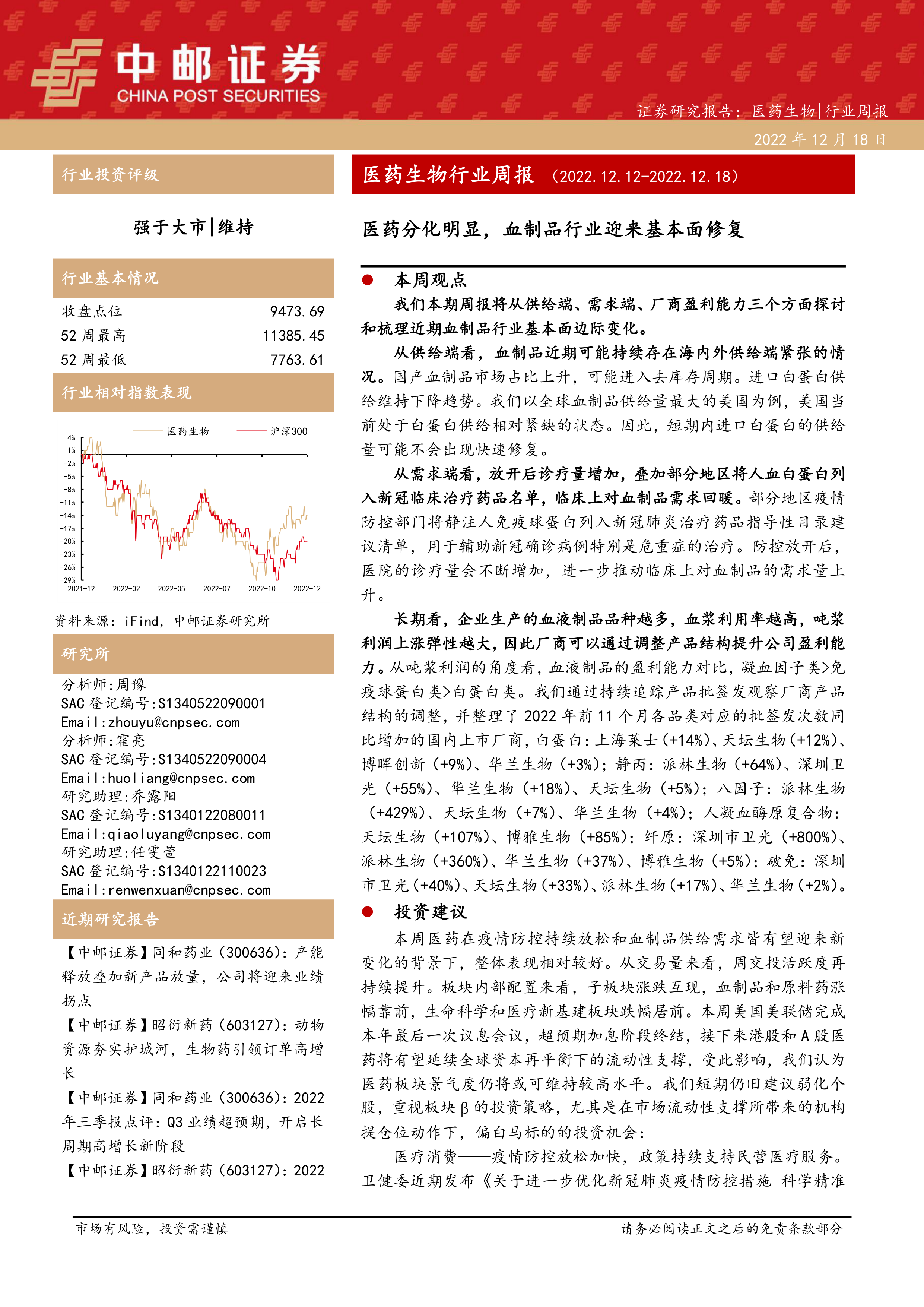 本周报告重点关注血制品行业,从供给端、需求端和厂商盈利能力三个方面分析了其基本面变化。供给端方面,海内外血制品供应持续紧张,进口白蛋白供给下降;需求端方面,疫情防控政策放松后,诊疗量增加,临床对血制品的需 求回暖。长期来看,厂商可以通过调整产品结构提升盈利能力。投资建议方面,报告建议弱化个股,重视板块β,关注医疗消费、医疗新基建、原料药、创新药和CRO等子行业的投资机会,并推荐了部分具体公司。