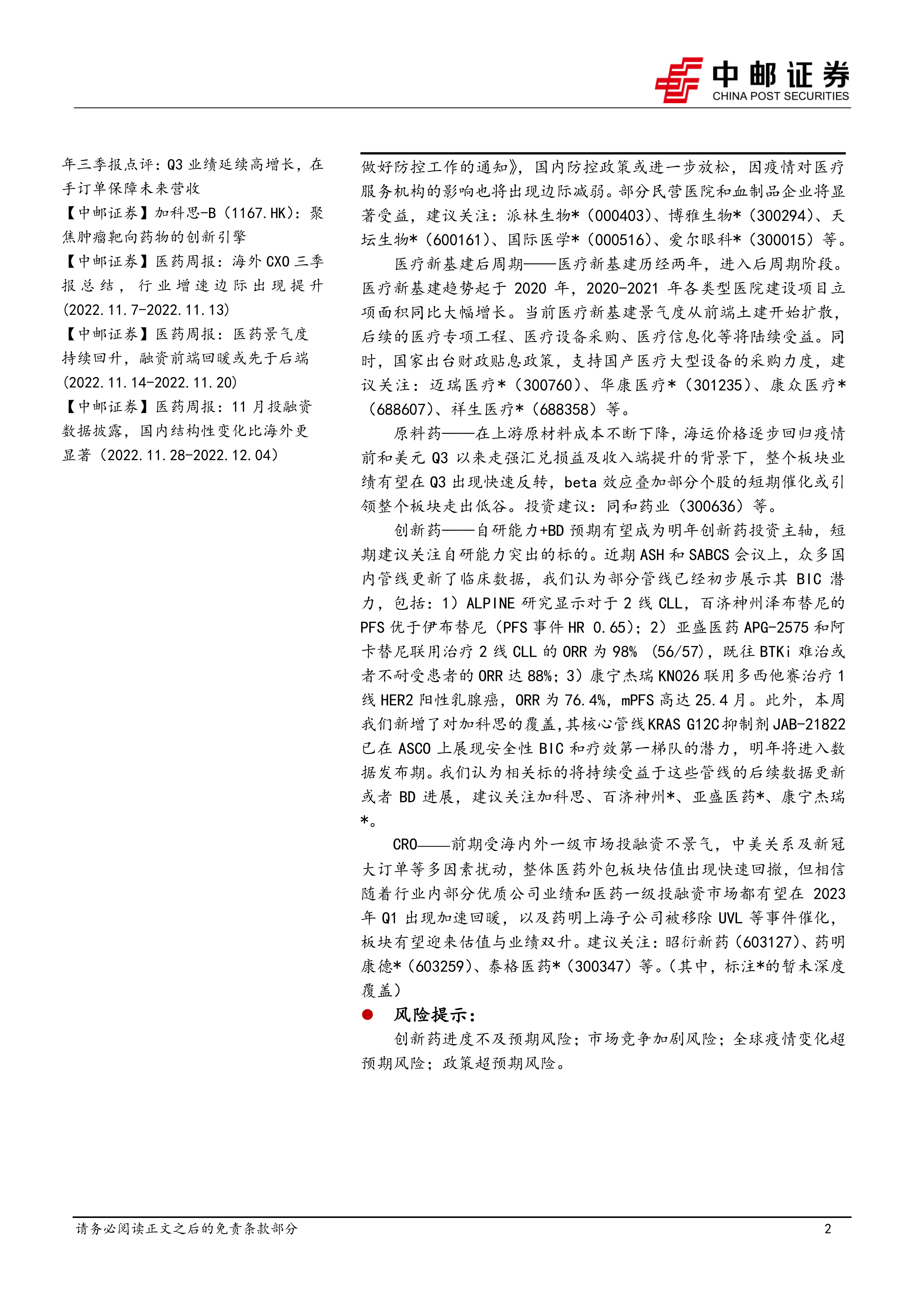 CRO——前期受海内外一级市场投融资不景气,中美关系及新冠大订单等多因素扰动,整体医药外包板块估值出现快速回撤,但相信随着行业内部分优质公司业绩和医药一级投融资市场都有望在2023年Q1出现加速回暖,以及药明上海子公司被移除UVL等事件催化,板块有望迎来估值与业绩双升。建议关注:昭衍新药(603127)、药明康德*(603259)、泰格医药*(300347)等。(其中,标注*的暂未深度覆盖)