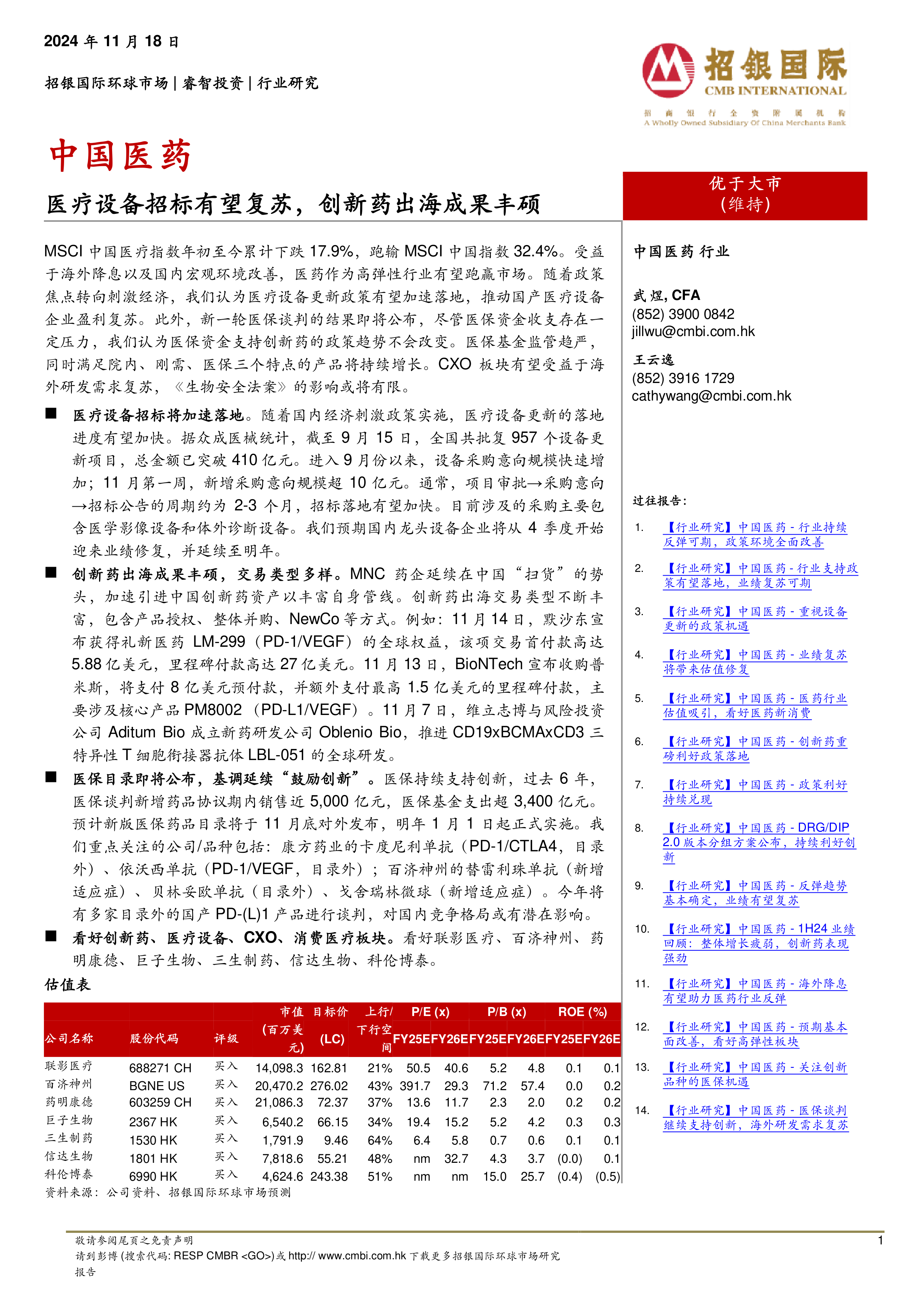 本报告基于招银国际环球市场对中国医药行业的分析,内容涵盖多个方面,主要包括: