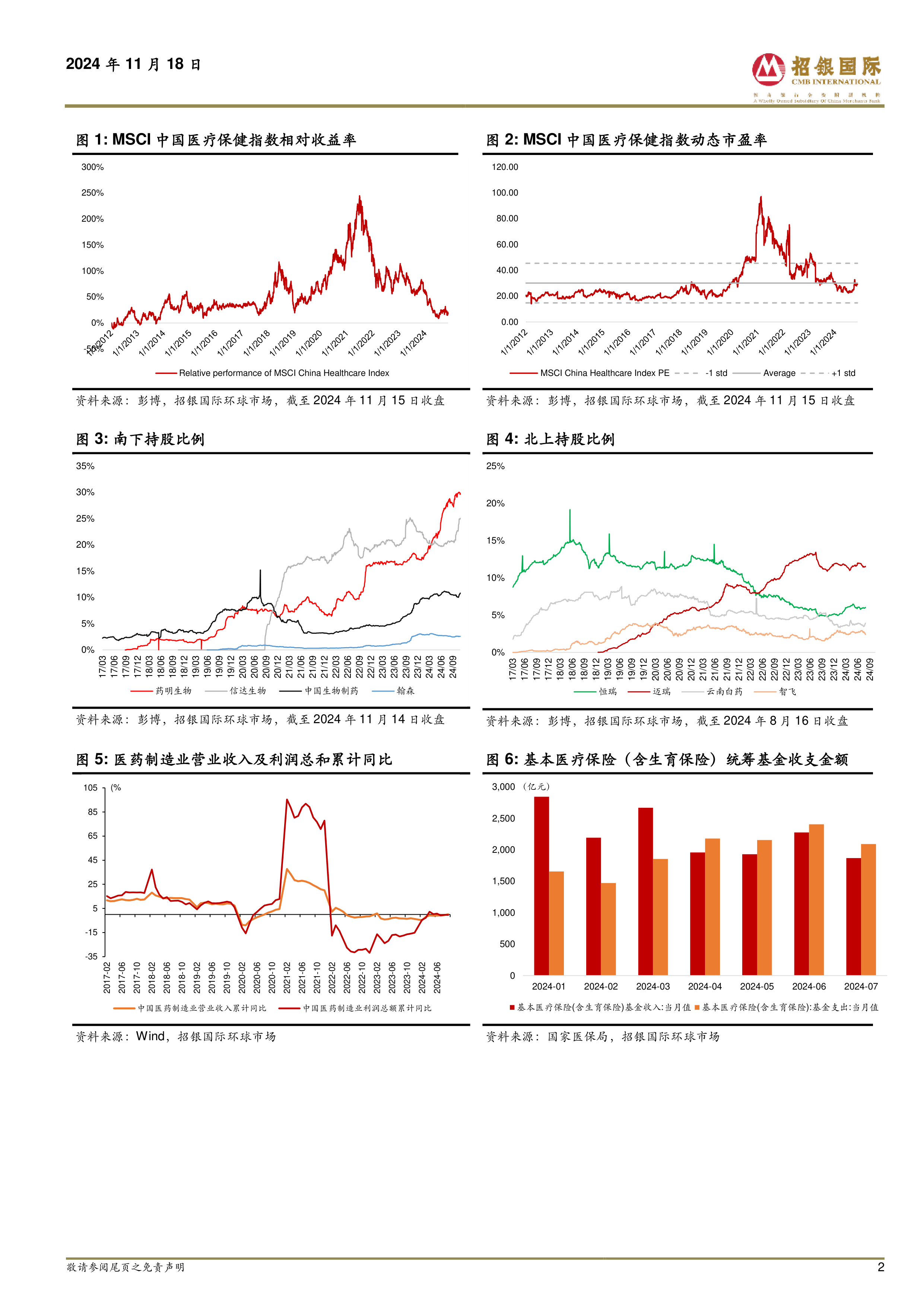 MSCI中国医疗指数年初至今累计下跌17.9%,跑输MSCI中国指数32.4%。受益于海外降息以及国内宏观环境改善,医药作为高弹性行业有望跑赢市场。随着政策焦点转向刺激经济,我们认为医疗设备更新政策有望加速落地,推动国产医疗设备企业盈利复苏。此外,新一轮医保谈判的结果即将公布,尽管医保资金收支存在一定压力,我们认为医保资金支持创新药的政策趋势不会改变。医保基金监管趋严,同时满足院内、刚需、医保三个特点的产品将持续增长。CXO板块有望受益于海外研发需求复苏,《生物安全法案》的影响或将有限。