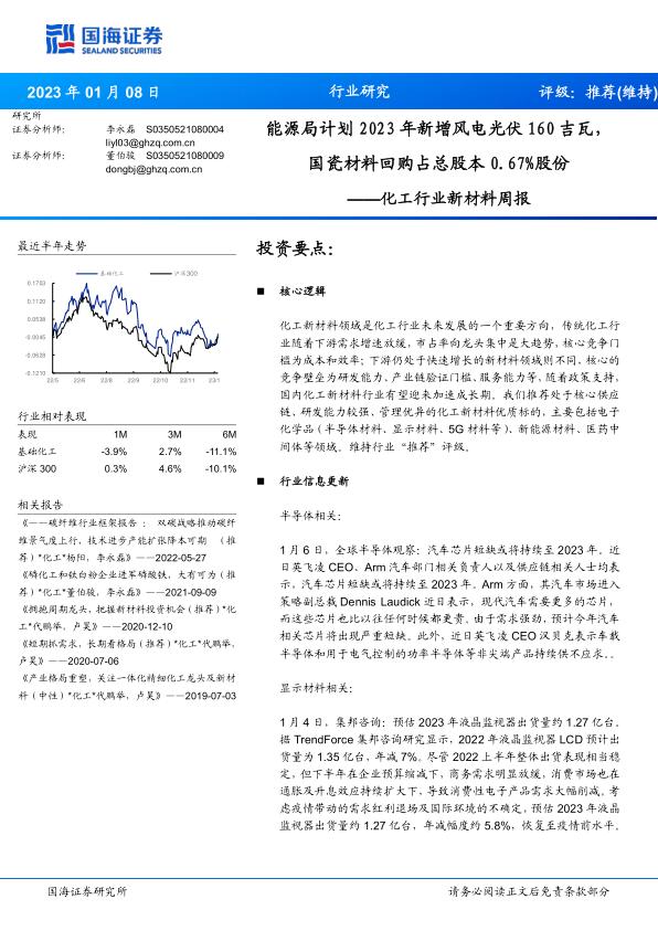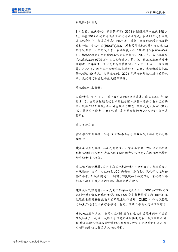 化工行业新材料周报:能源局计划2023年新增风电光伏160吉瓦,国瓷材料回购占总股本0.67%股份
