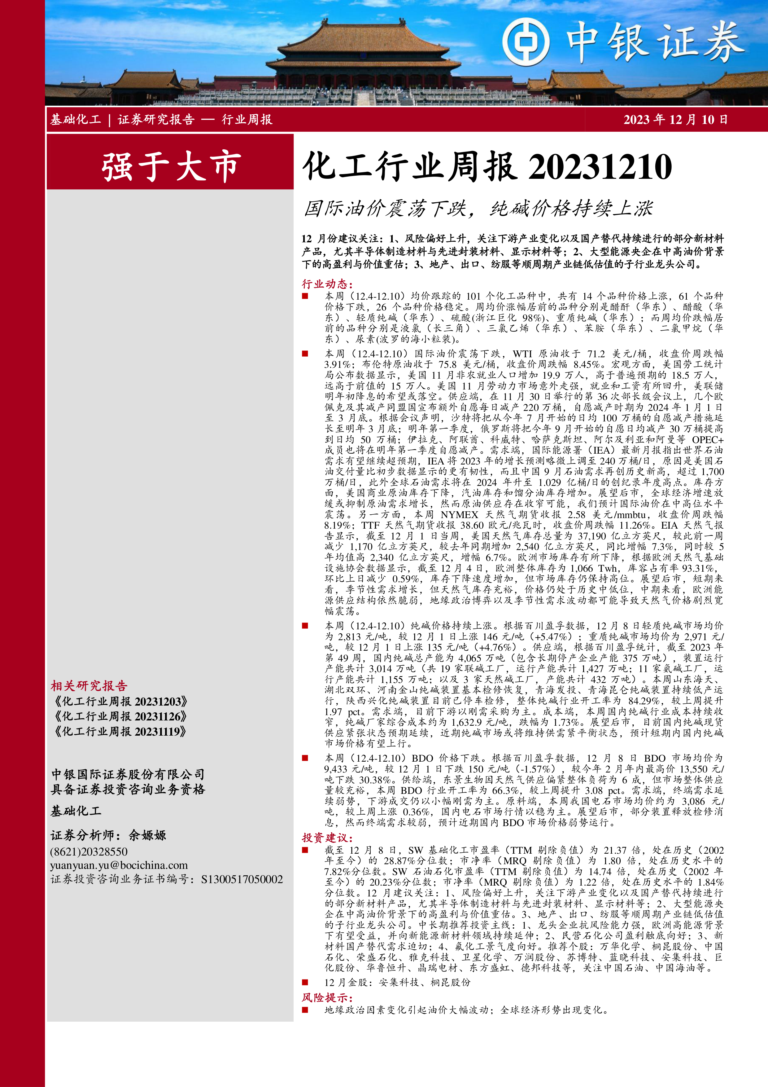 化工行业周报:国际油价震荡下跌,纯碱价格持续上涨