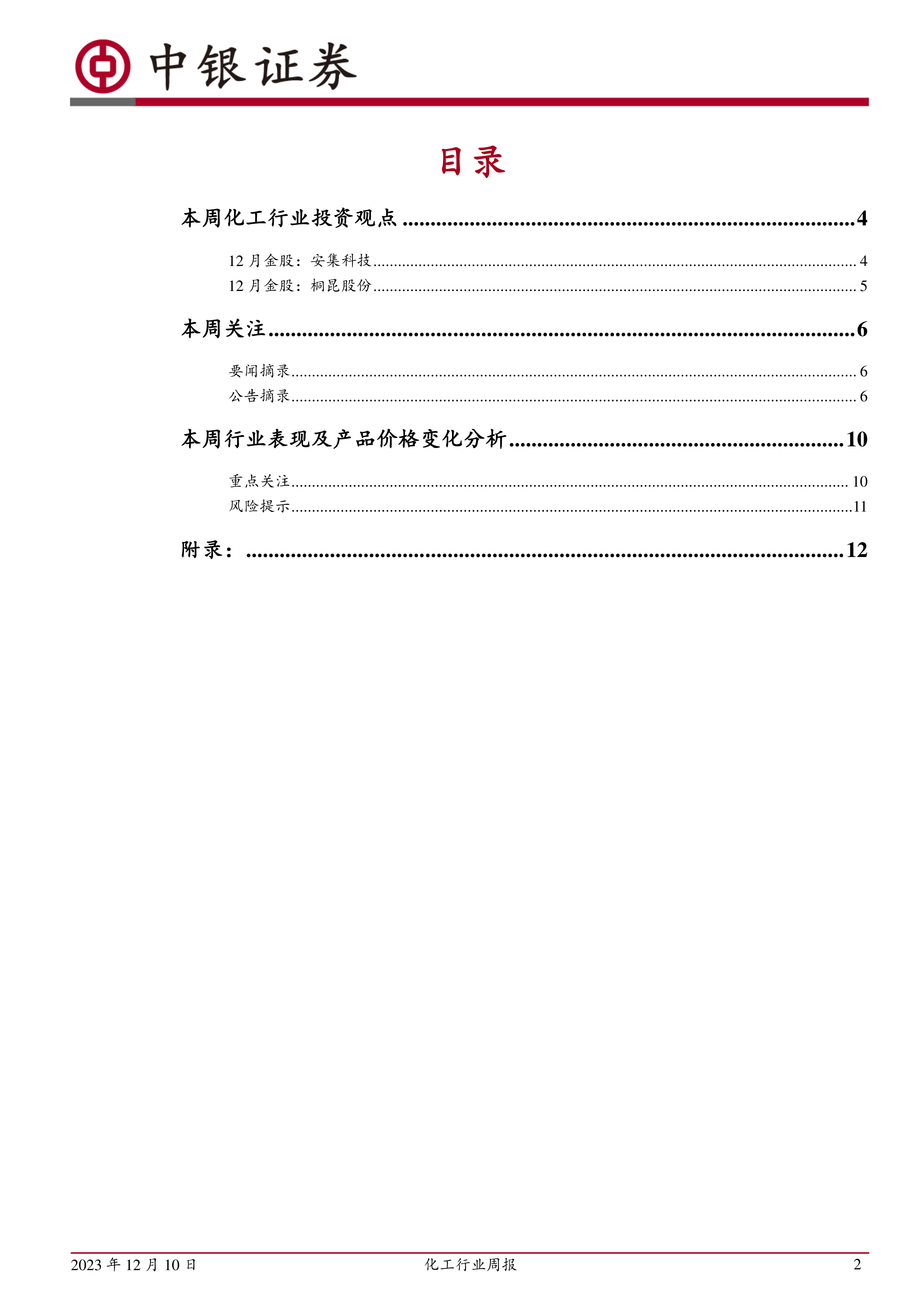 12月份建议关注:1、风险偏好上升,关注下游产业变化以及国产替代持续进行的部分新材料产品,尤其半导体制造材料与先进封装材料、显示材料等;2、大型能源央企在中高油价背景下的高盈利与价值重估;3、地产、出口、纺服等顺周期产业链低估值的子行业龙头公司。