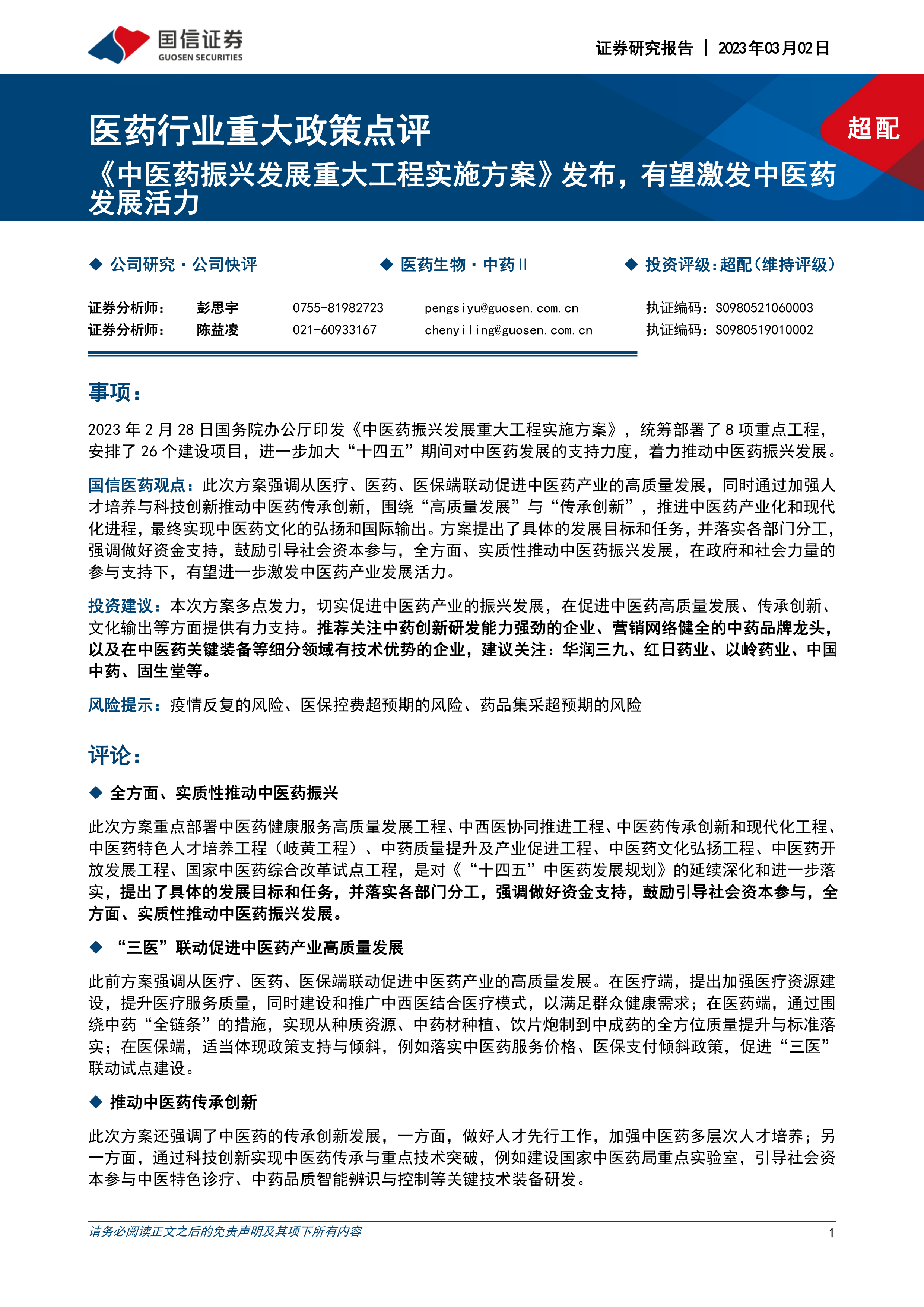 这份报告主要围绕《中医药振兴发展重大工程实施方案》展开分析,并结合国信证券的投资观点,对中医药行业未来的发展趋势和投资机会进行预测。