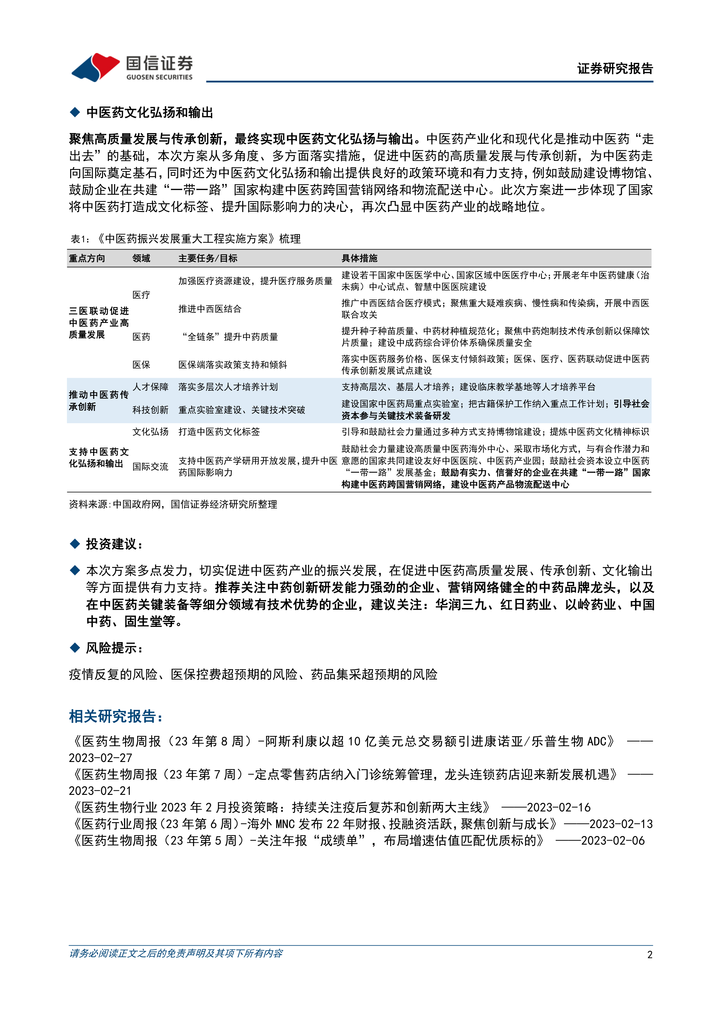 报告建议投资者关注以下几类企业:拥有强大中药创新研发能力的企业;拥有健全营销网络的中药品牌龙头企业;在中医药关键装备等细分领域具备技术优势的企业。报告列举了华润三九、红日药业、以岭药业、中国中药、固生堂等公司作为潜在的投资标的。 同时,报告也指出了疫情反复、医保控费超预期以及药品集采超预期等潜在风险。
