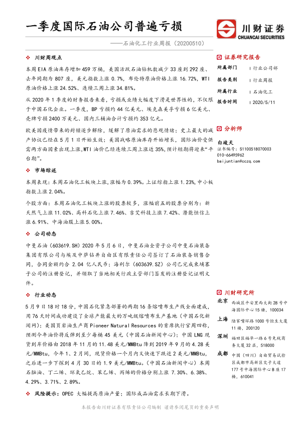 石油化工行业周报:一季度国际石油公司普遍亏损