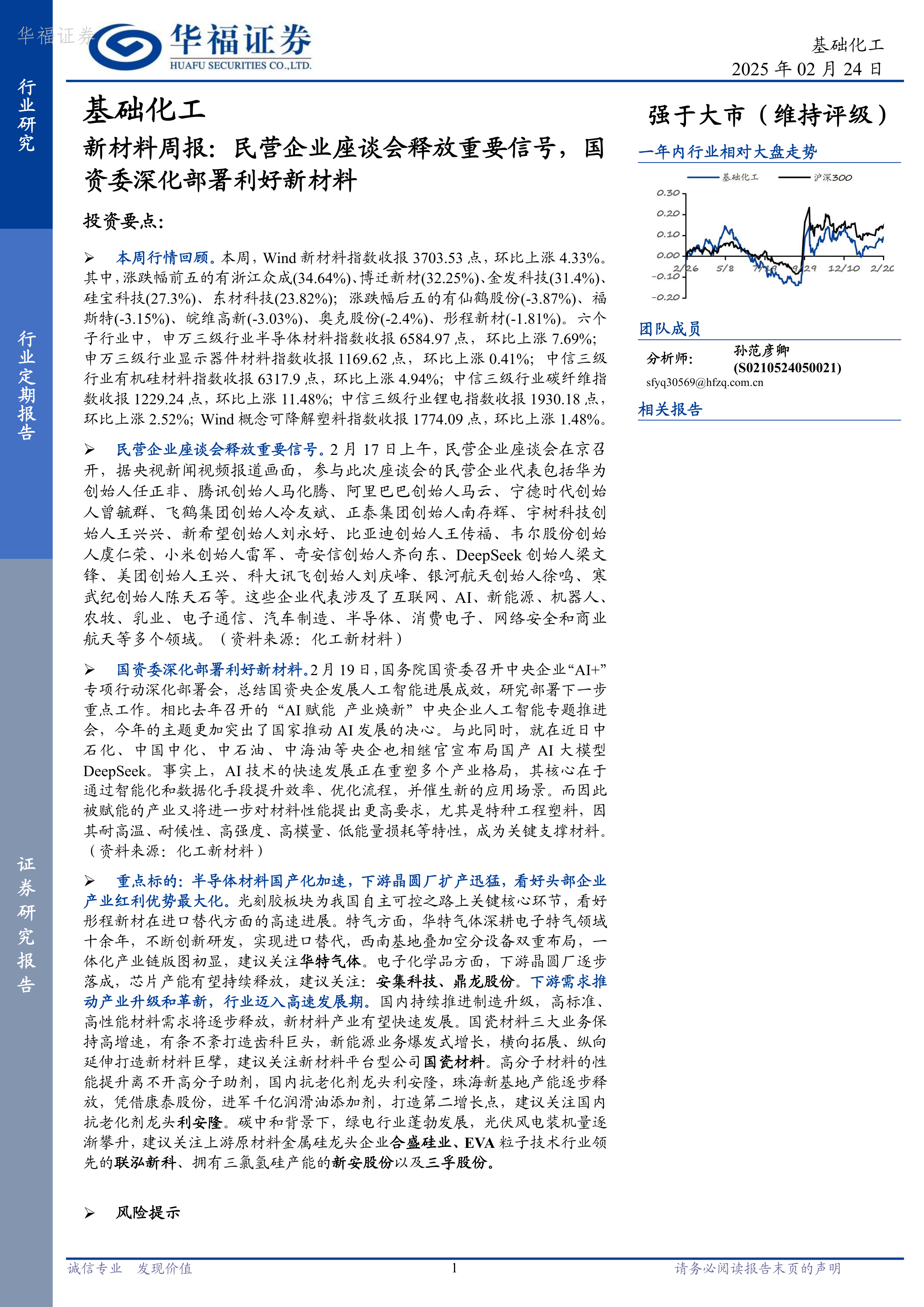 2月17日召开的民营企业座谈会和2月19日国资委召开的中央企业“AI+”专项行动深化部署会,均释放出积极信号,为新材料行业发展注入强心剂。 座谈会邀请了众多来自不同领域的民营企业代表,涵盖了AI、新能源、半导体等多个与新材料密切相关的领域,体现了国家对民营经济的支持和重视。 国资委的“AI+”行动则强调了国家推动AI发展的决心,而AI技术的快速发展将进一步推动新材料领域的技术升级和应用创新,特别是对高性能材料的需求将持续增长。