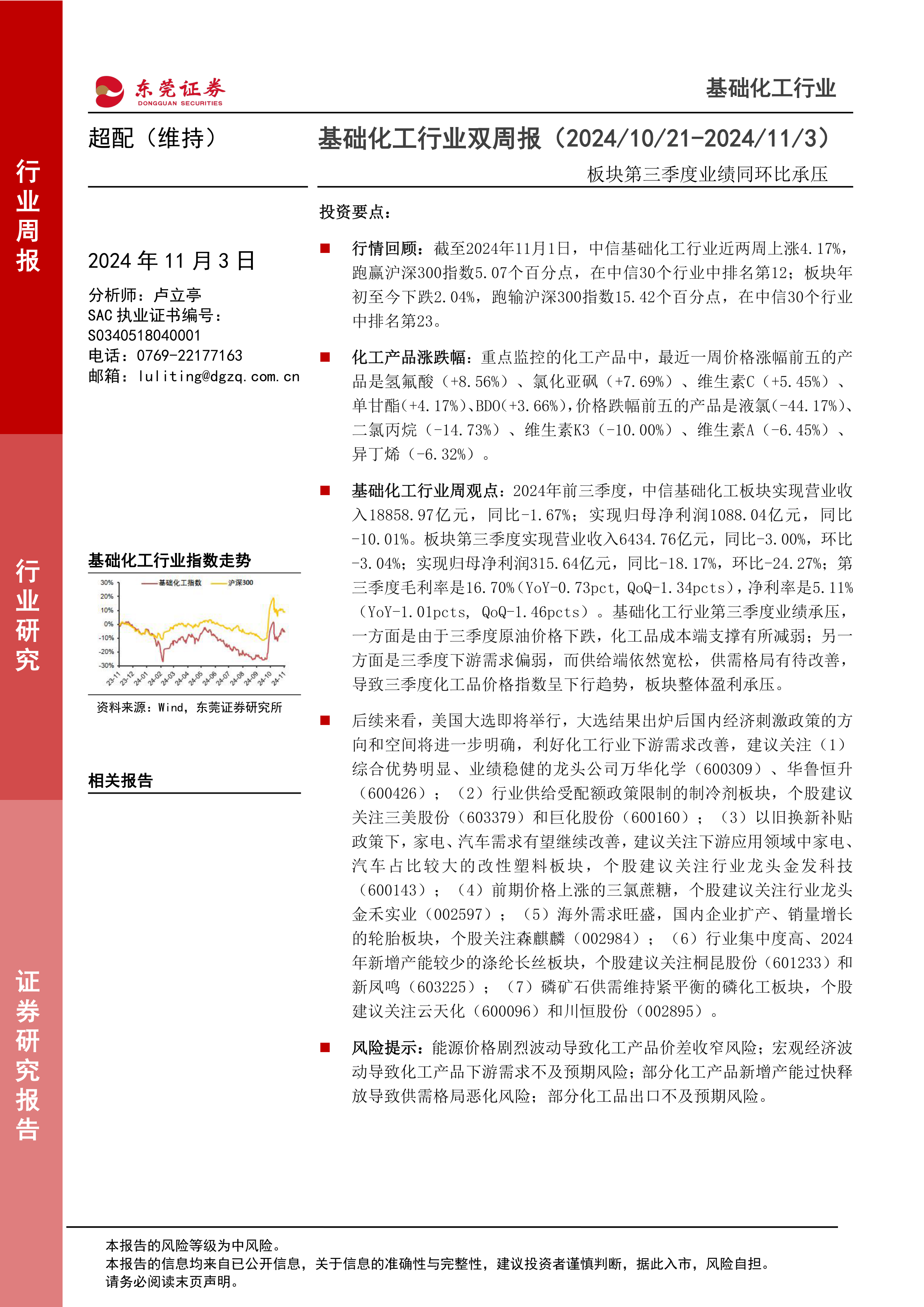 本报告对2024年10月21日至11月3日基础化工行业进行了周度回顾和分析。报告指出,尽管三季度基础化工行业业绩承压,但基于美国大选后潜在的政策利好以及部分细分行业的良好发展态势,维持对该行业的“超配”评级。报告详细分析了行业行情、化工产品价格波动、部分上市公司三季报业绩以及未来投资建议,并提示了潜在的投资风险。 投资者应结合自身风险承受能力和投资目标,谨慎参考报告内容进行投资决策。