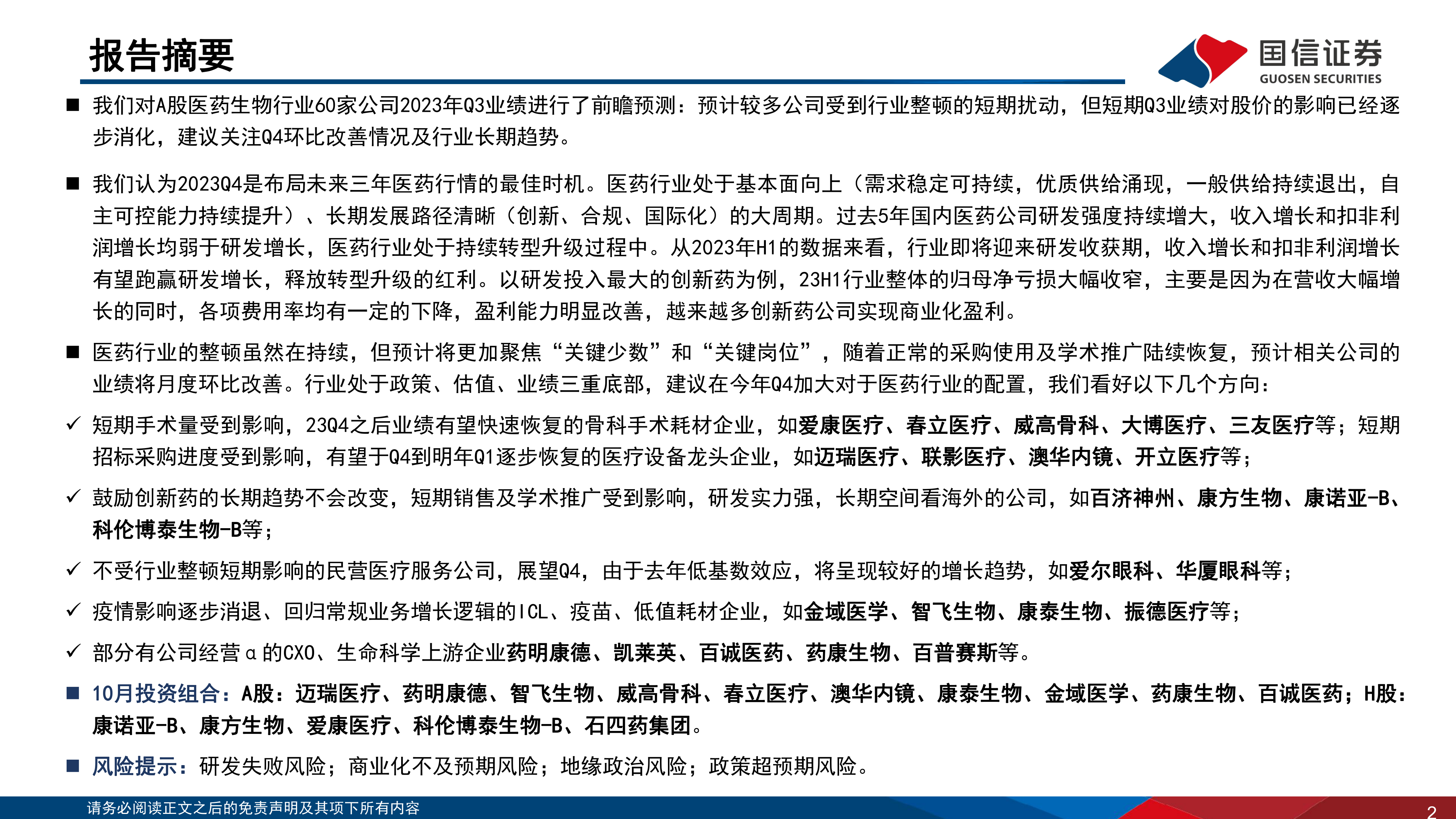本报告的核心观点是:尽管2023年Q3部分医药公司业绩受到行业整顿的短期扰动,但其对股价的影响已逐步消化。报告建议关注Q4业绩环比改善情况及行业长期趋势,并认为2023年Q4是布局未来三年医药行情的最佳时机。 报告基于对60家A股医药生物公司Q3业绩的前瞻性预测,分析了不同细分行业的市场表现,并推荐了具体的投资组合,涵盖创新药、医疗器械、医疗服务、CXO和中药等多个领域。 报告强调医药行业正处于基本面向上、长期发展路径清晰的大周期,并指出行业整顿将更加聚焦“关键少数”,预计相关公司业绩将月度环比改善。