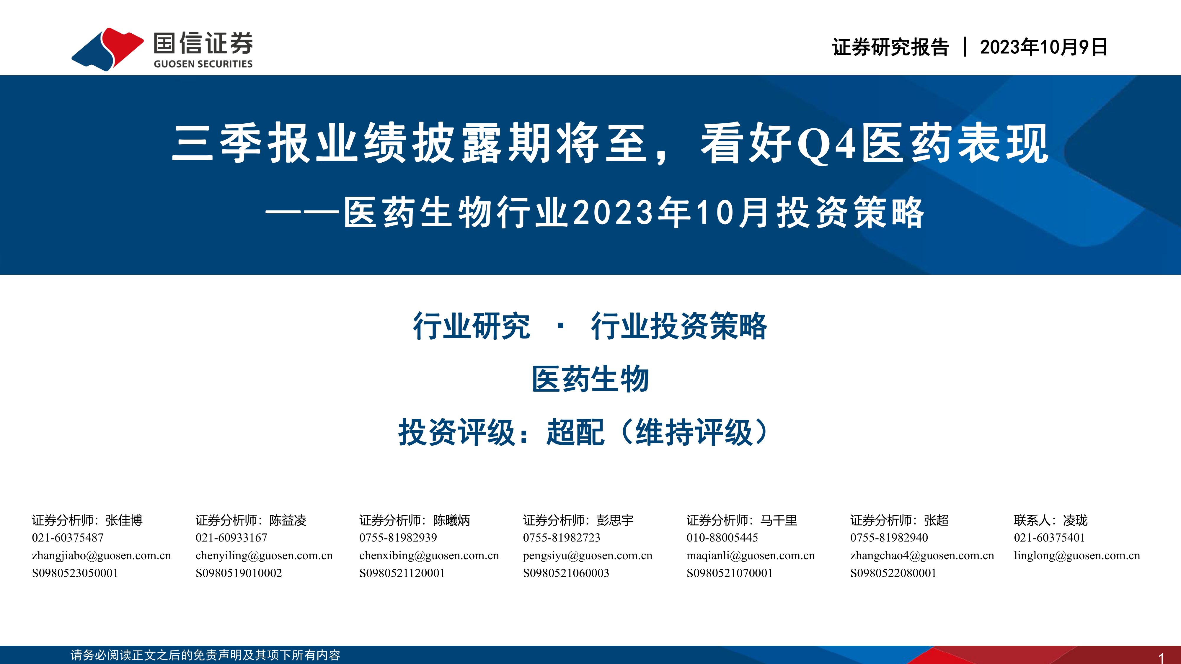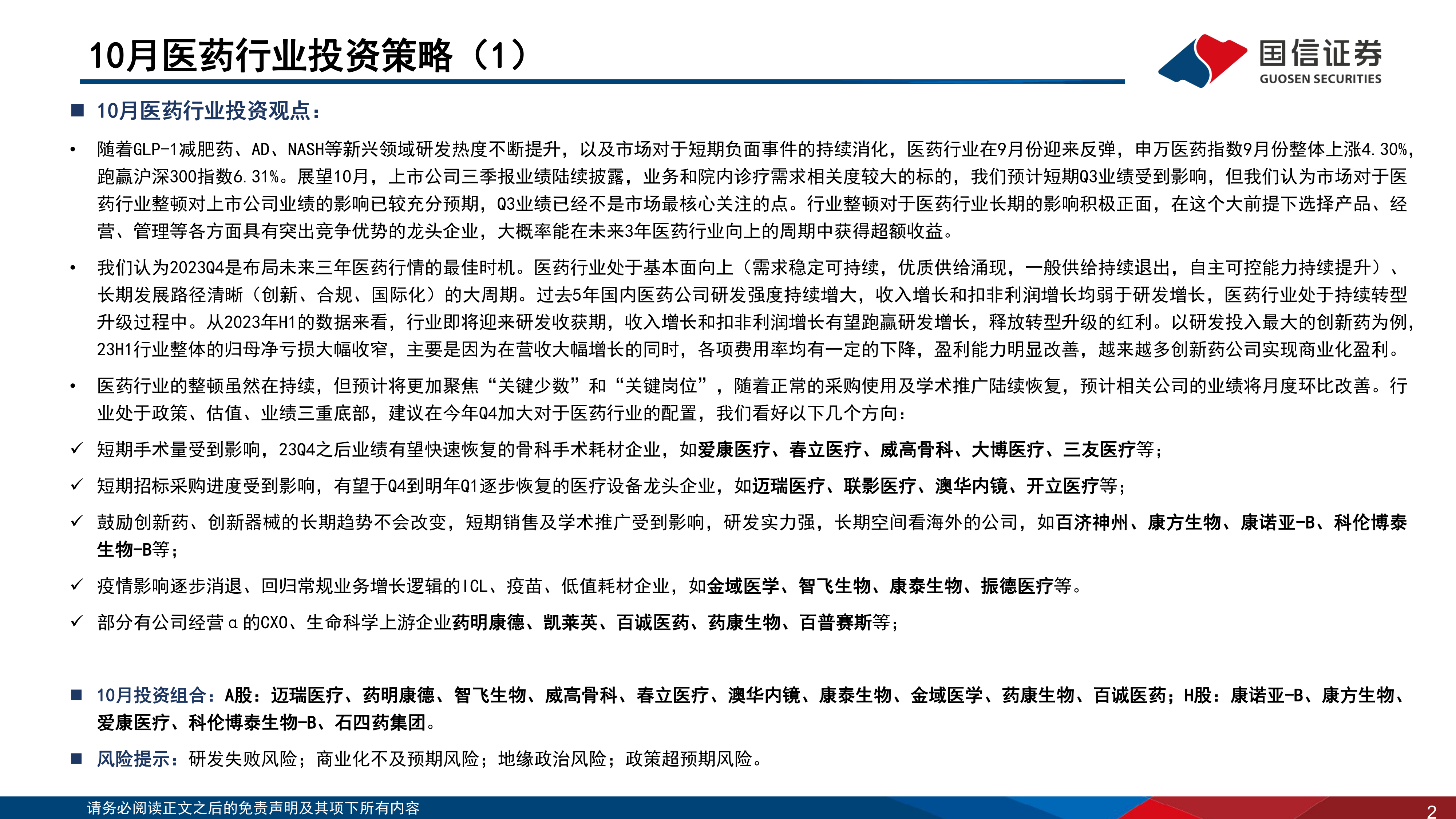 医药生物行业2023年10月投资策略:三季报业绩披露期将至,看好Q4医药表现
