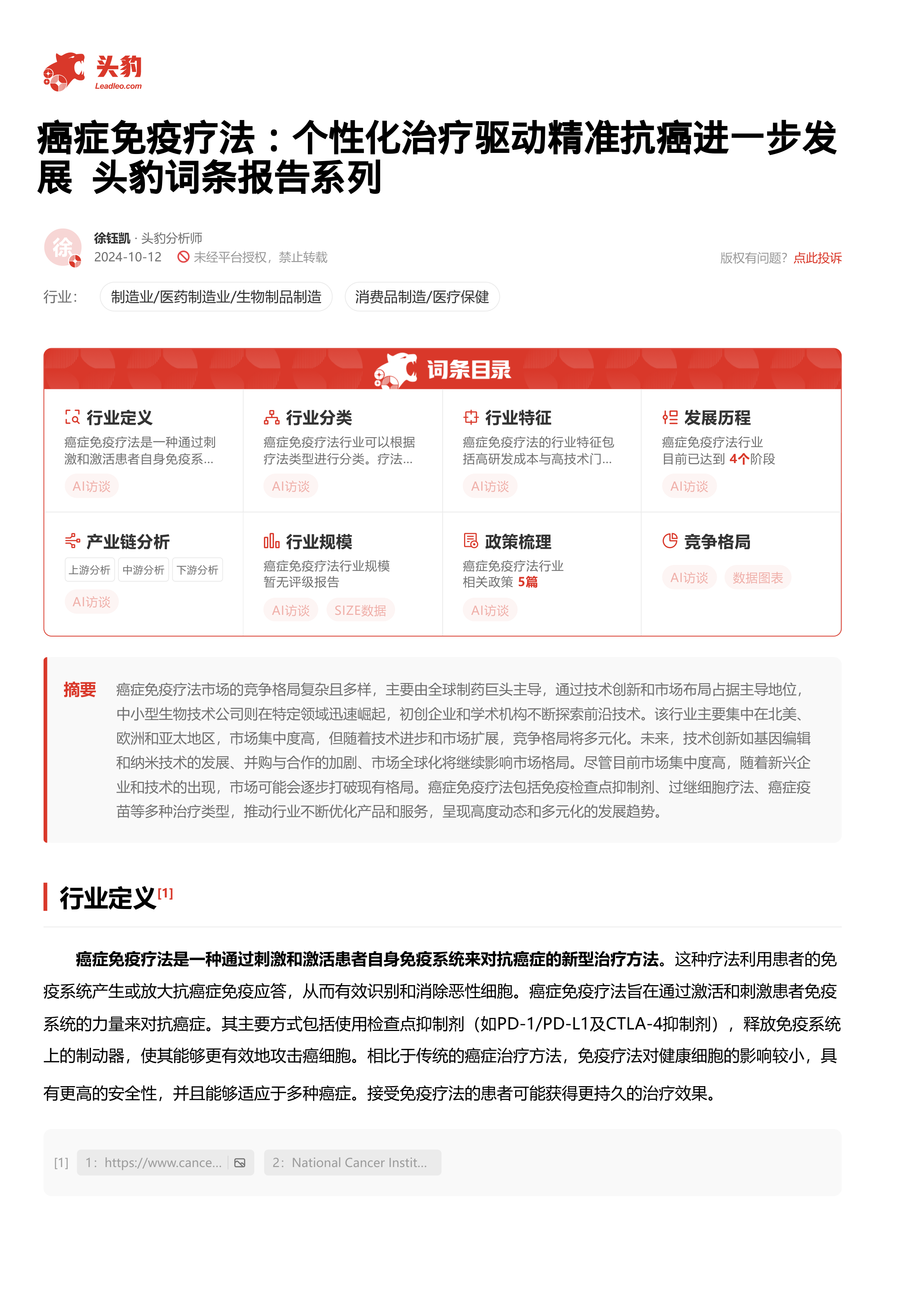 本报告基于Leadleo.com平台发布的《癌症免疫疗法:个性化治疗驱动精准抗癌进一步发展》头豹词条报告,运用数据和统计分析方法,对癌症免疫疗法市场进行深入解读。报告核心观点如下: