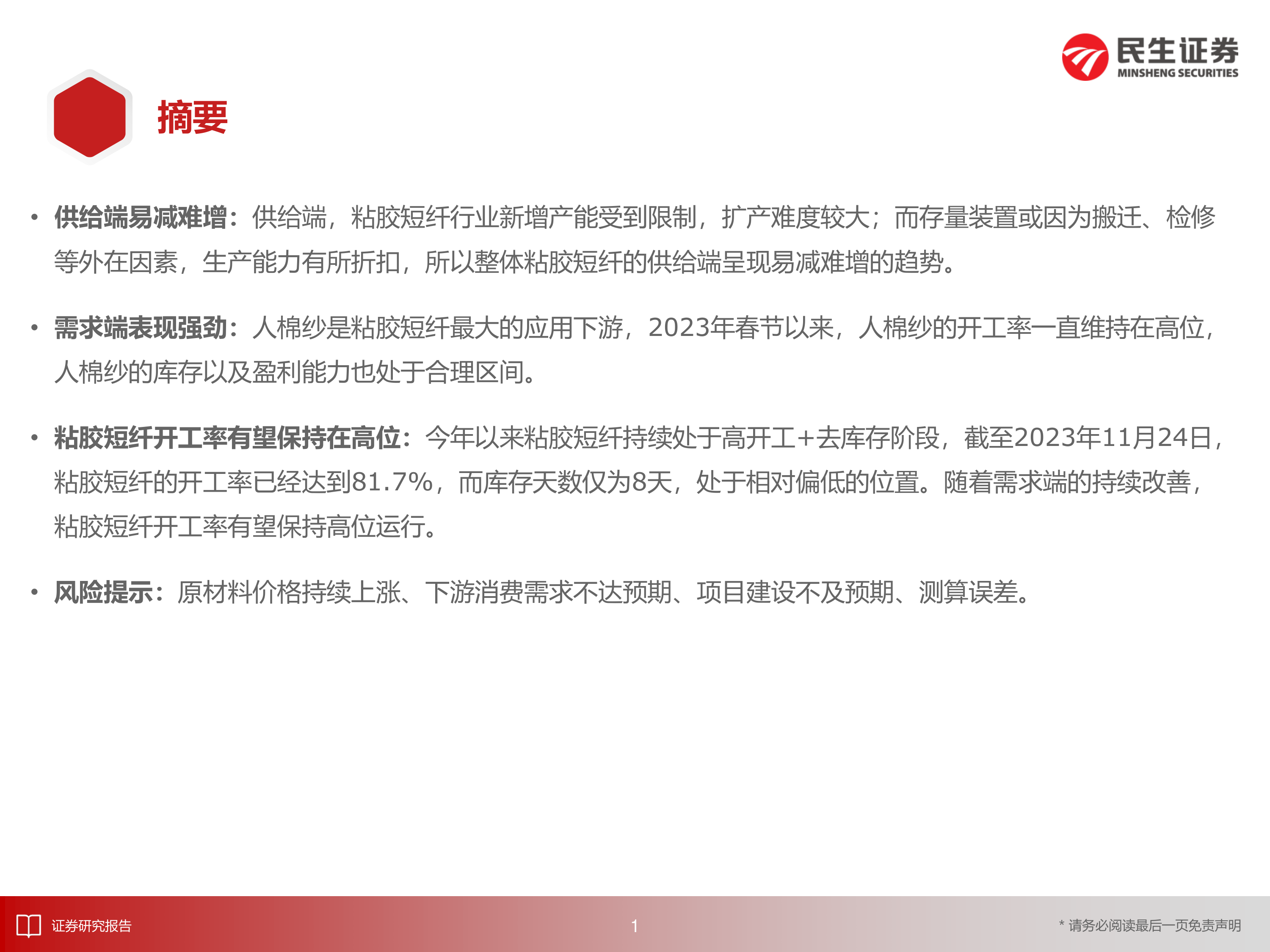 本报告的核心观点是:粘胶短纤行业供需格局向好,产业链有望维持高开工率。具体而言,供给端新增产能受限,扩产难度大,存量装置生产能力受限,导致供给易减难增;需求端,主要下游人棉纱开工率维持高位,库存和盈利能力处于合理区间,需求强劲;供需错配下,粘胶短纤开工率有望保持高位,具备涨价基础。报告并对重点公司三友化工和中泰化学进行了分析,给出投资建议。
