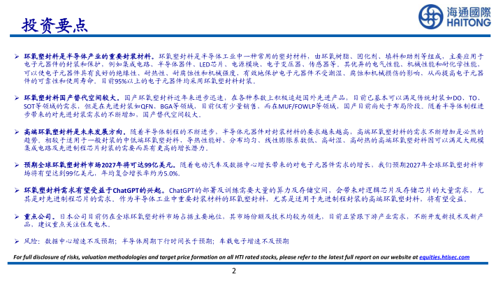 本报告的核心观点是:环氧塑封料作为半导体封装的关键材料,市场规模巨大且增长迅速,尤其高端产品需求增长潜力巨大。中国环氧塑封料产业虽然近年来进步显著,但在高端领域仍与日美企业存在差距,国产替代空间巨大,未来发展方向是高端环氧塑封料的研发和生产。ChatGPT等AI技术的兴起将进一步推动高端环氧塑封料的需求增长。