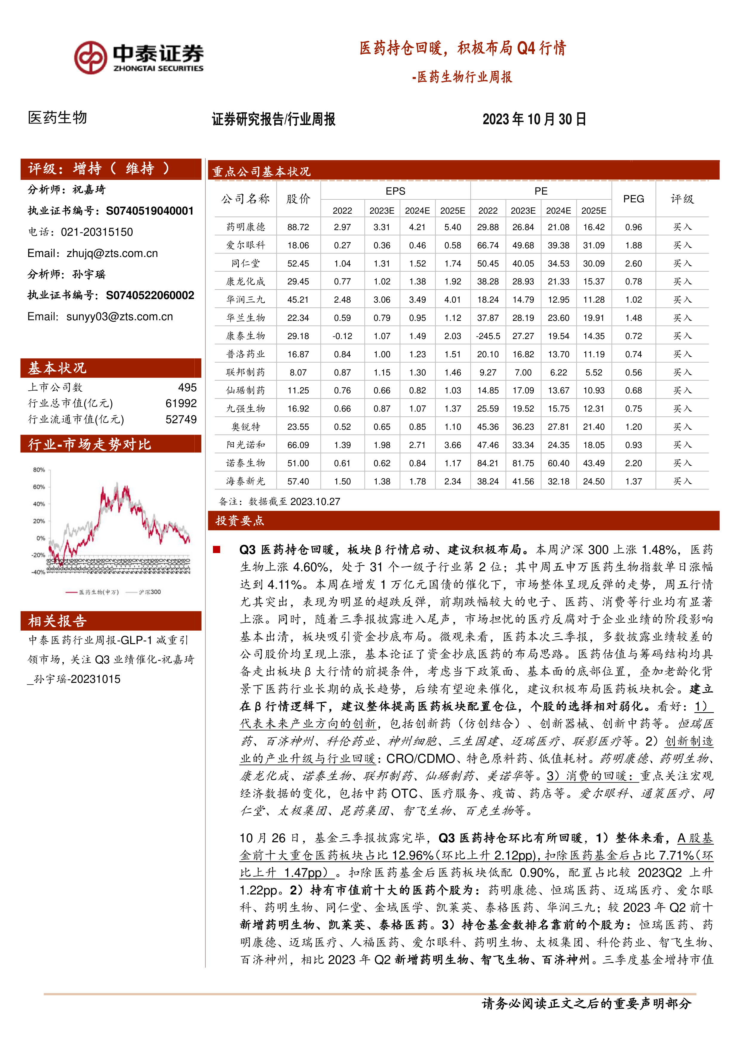 医药生物行业周报:医药持仓回暖,积极布局Q4行情