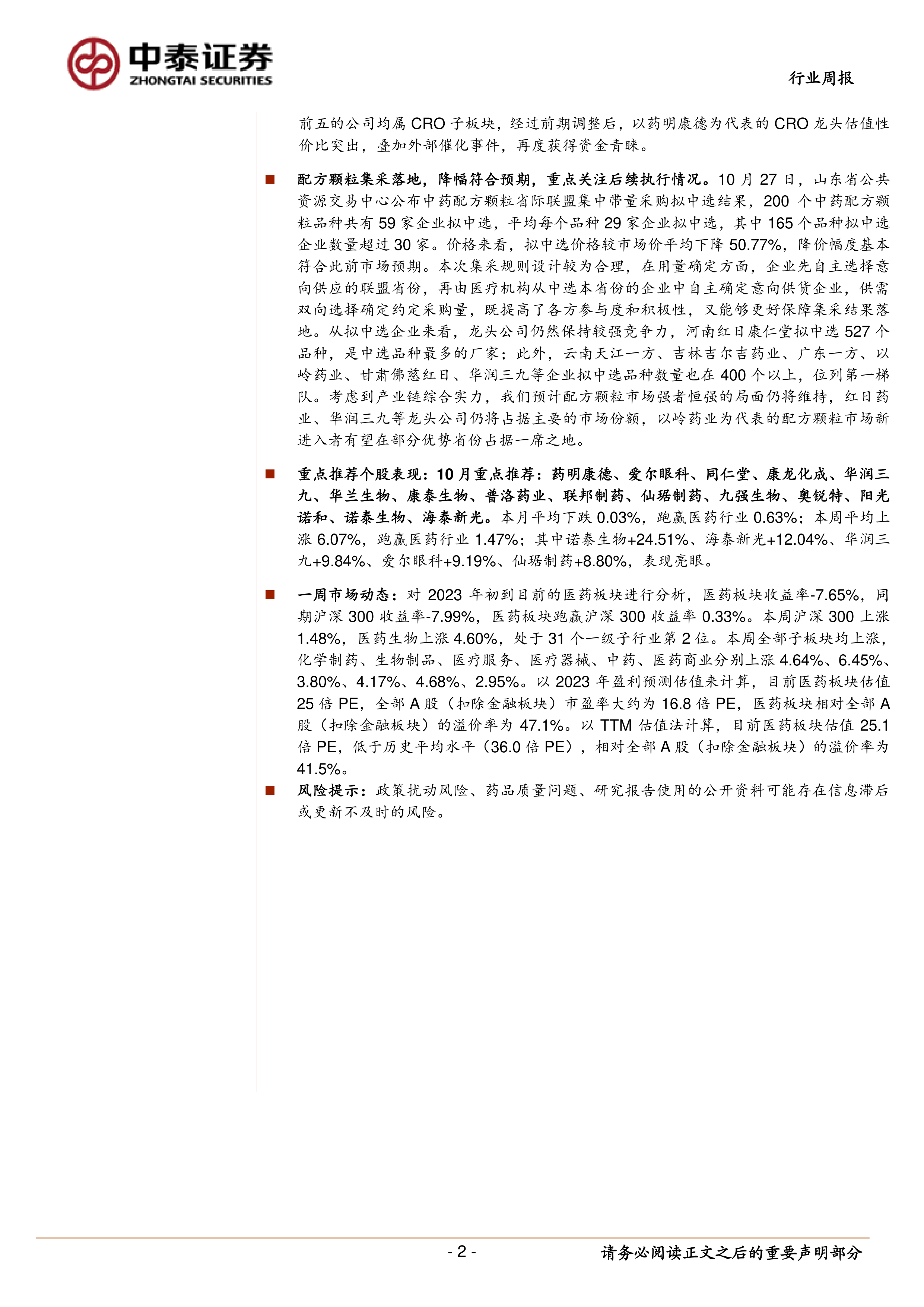 本报告分析了医药板块在Q3的持仓回暖和板块β行情的启动,认为其具备进一步上涨的潜力。报告深入分析了配方颗粒集采的影响,以及基金三季报持仓变化对医药板块的投资意义。同时,报告对医药板块的估值、子行业表现、重点推荐个股以及行业热点事件进行了详细解读,并提供了维生素价格的跟踪数据。 总而言之,报告建议投资者积极布局医药板块,并重点关注创新药、CRO/CDMO等高成长性领域。 但需注意政策扰动风险、药品质量问题等潜在风险。