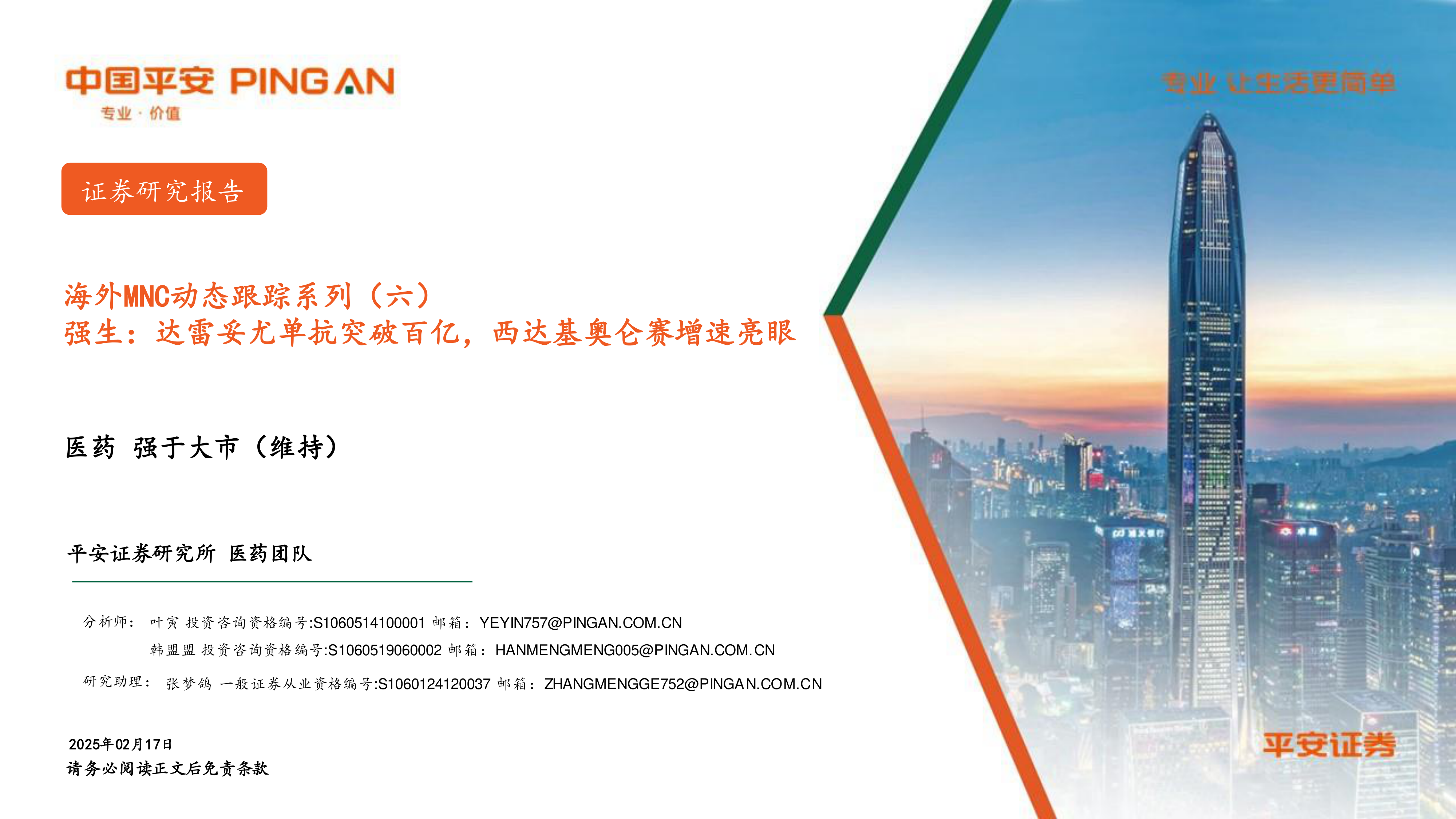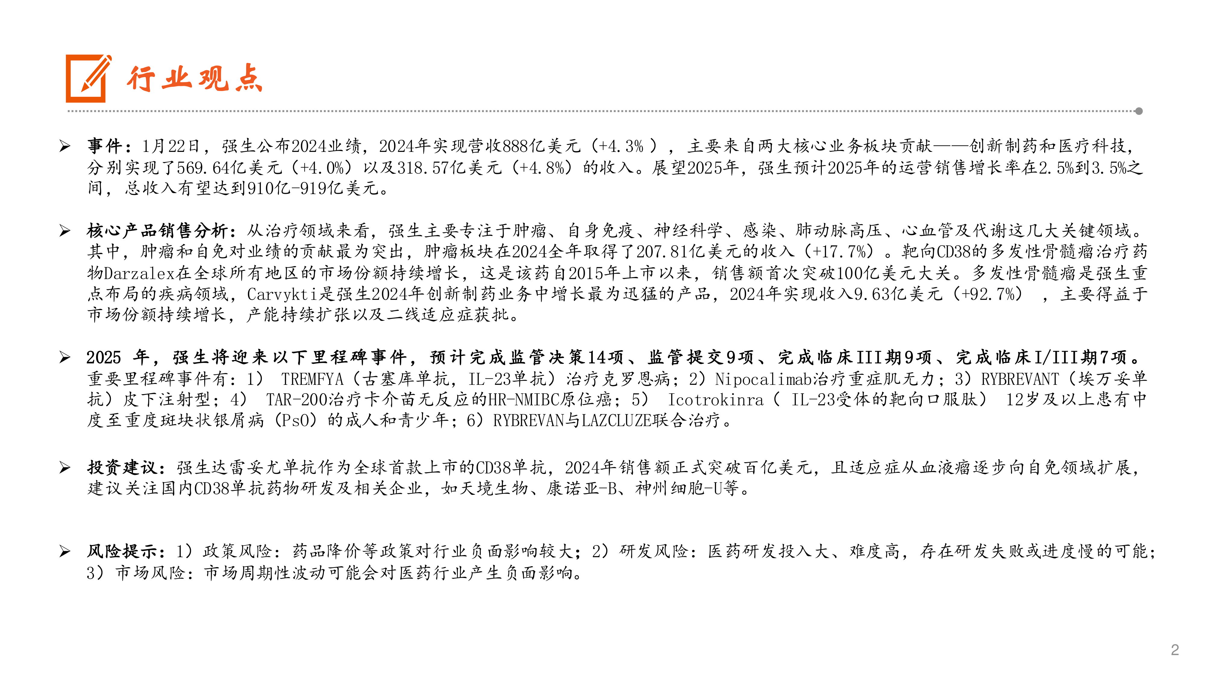 本报告的核心观点是:强生2024年业绩稳健增长,达雷妥尤单抗销售额突破百亿美元,展现出强劲的创新能力和市场竞争力。 未来,强生将继续专注于肿瘤、自身免疫等核心领域,并通过产品线拓展和研发管线推进,保持持续增长势头。 报告建议关注国内CD38单抗药物研发及相关企业。