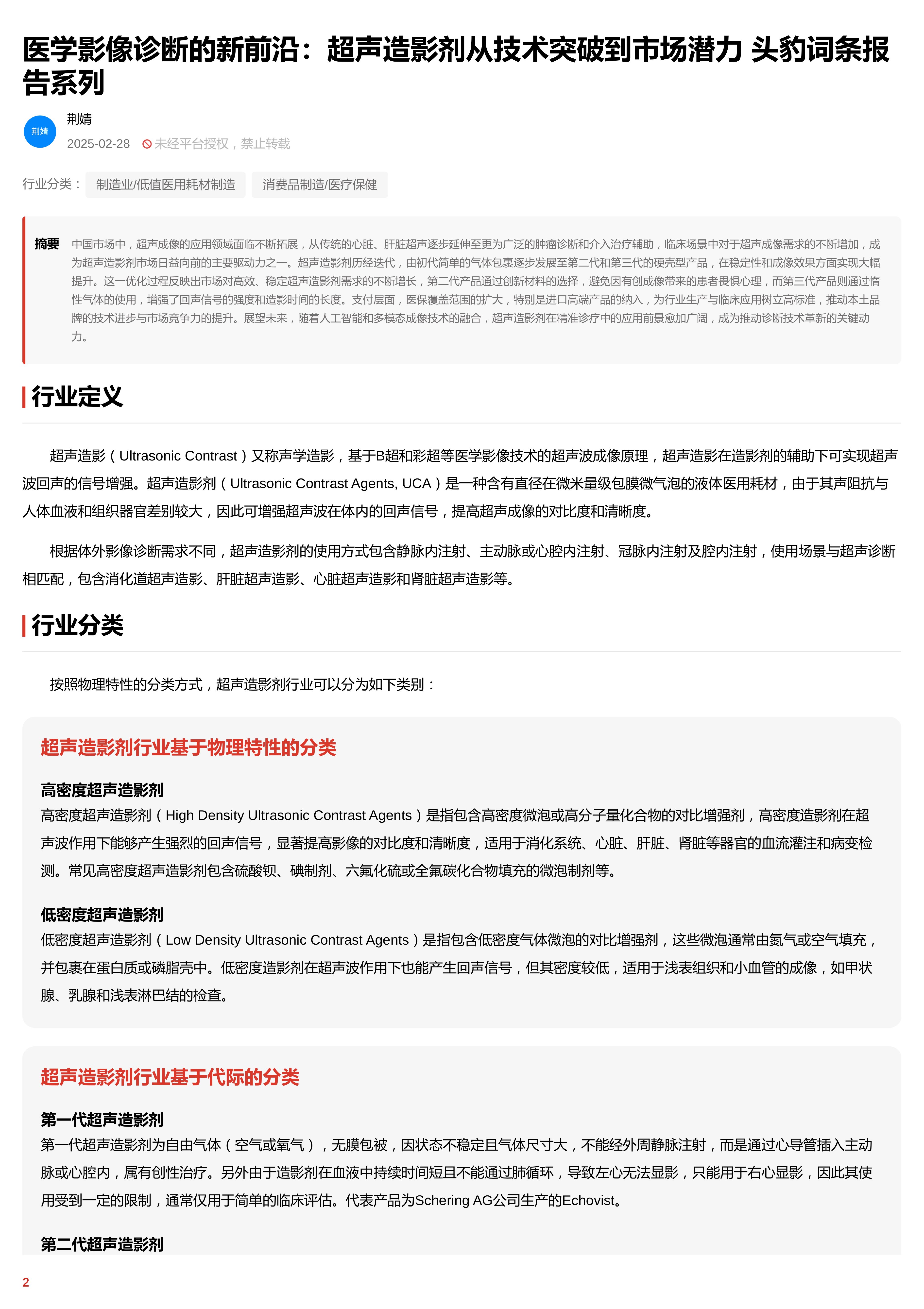 医学影像诊断的新前沿:超声造影剂从技术突破到市场潜力 头豹词条报告系列