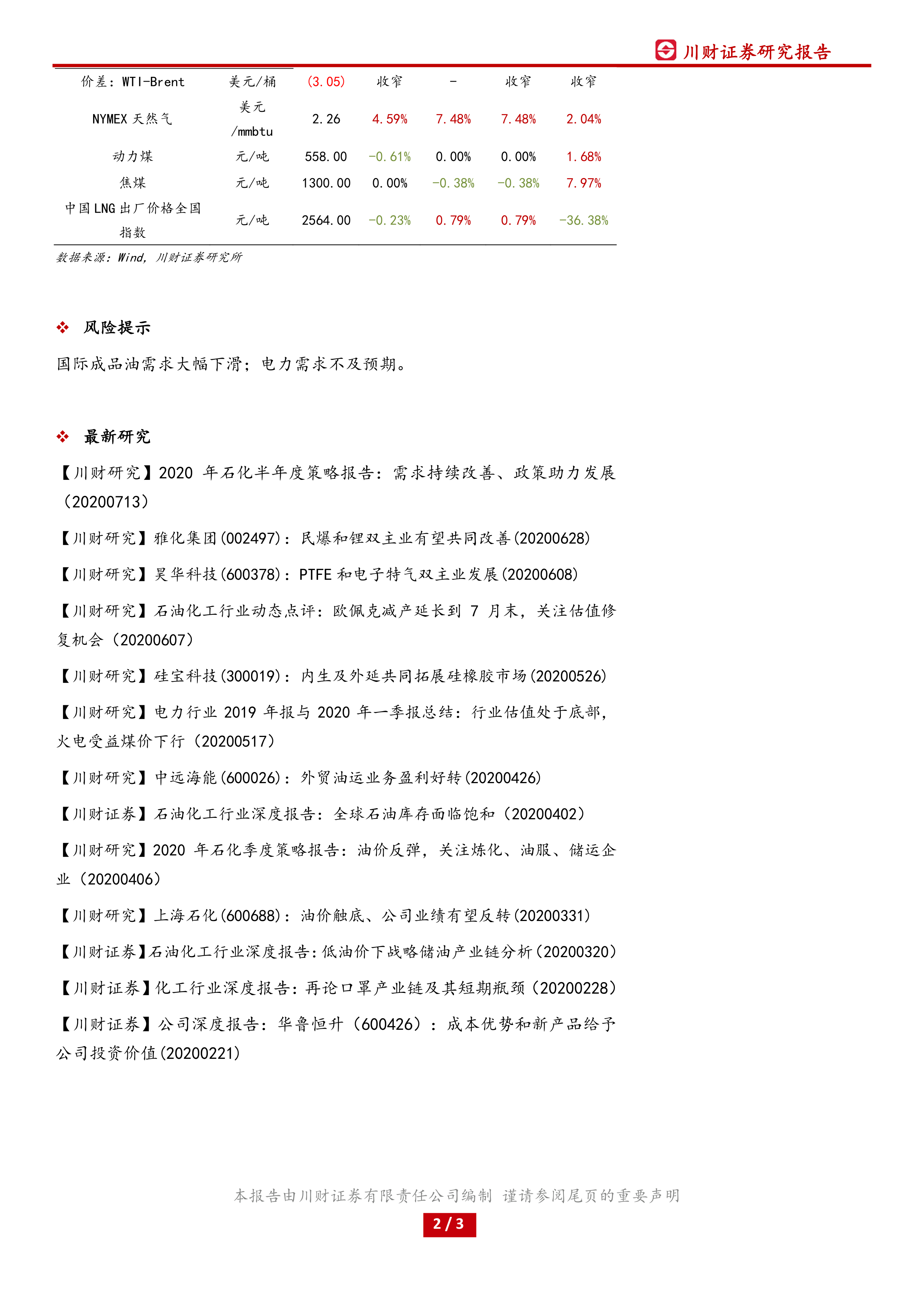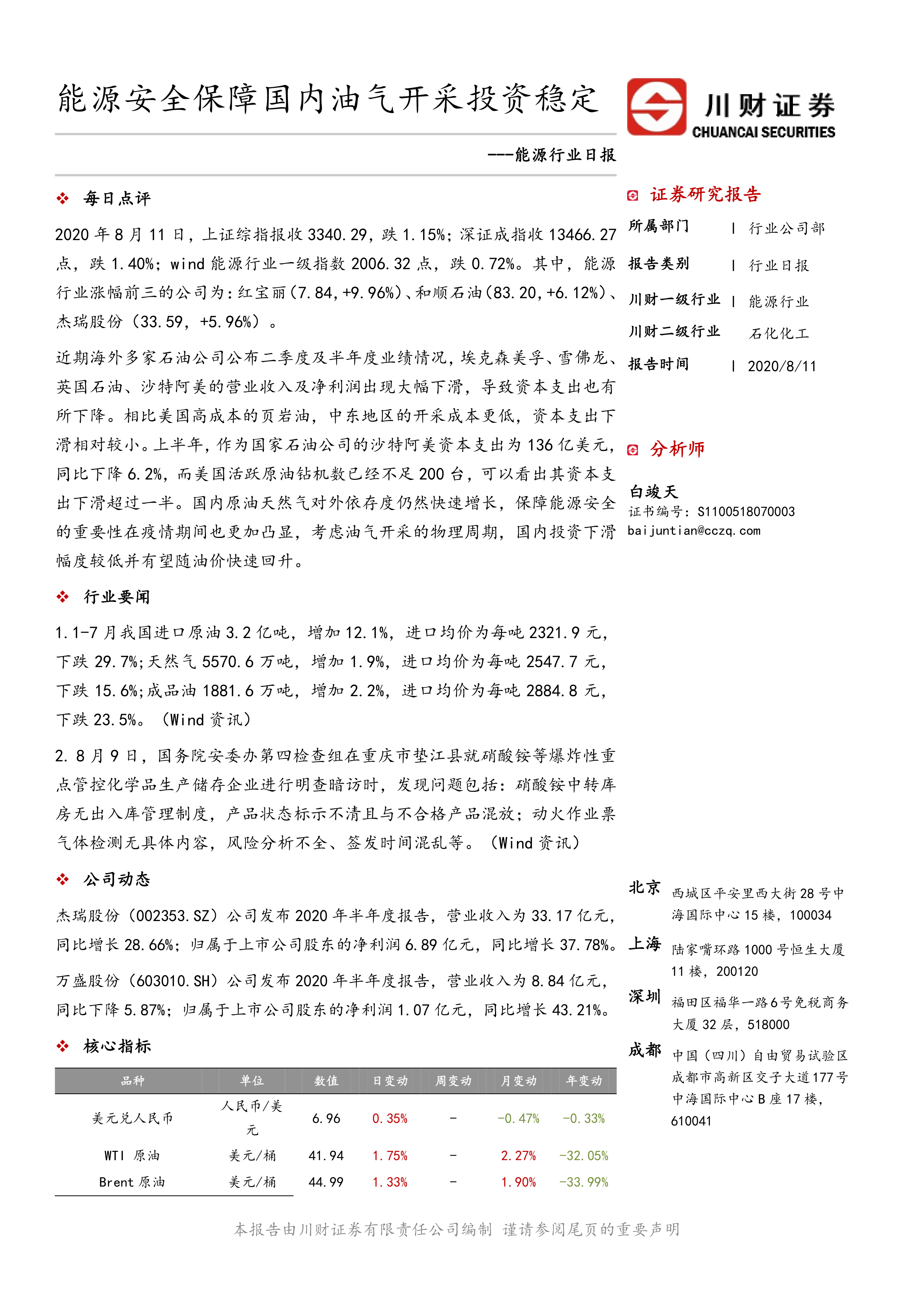 报告还分析了部分国内能源上市公司的业绩表现。杰瑞股份2020年上半年营业收入同比增长28.66%,归属于上市公司股东的净利润同比增长37.78%;万盛股份2020年上半年营业收入同比下降5.87%,但归属于上市公司股东的净利润同比增长43.21%。 此外,报告还提供了当日上证综指、深证成指和Wind能源行业一级指数的涨跌幅数据,以及能源行业涨幅前三的公司信息。