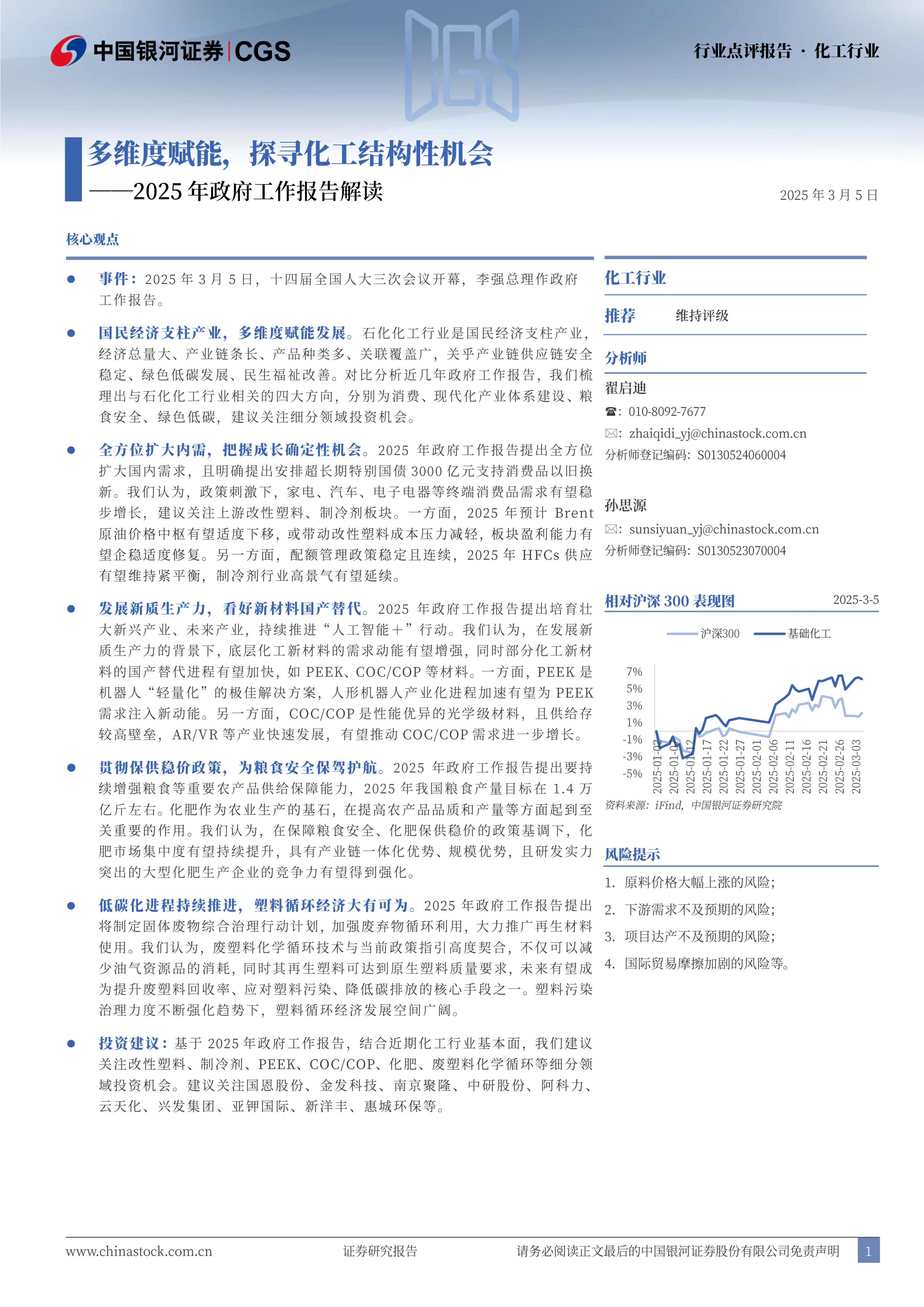 投资建议:基于2025年政府工作报告,结合近期化工行业基本面,我们建议关注改性塑料、制冷剂、PEEK、COC/COP、化肥、废塑料化学循环等细分领或投资机会。建议关注国恩股份、金发科技、南京聚隆、中研股份、阿科力、云天化、兴发集团、亚钾国际、新洋丰、惠城环保等。