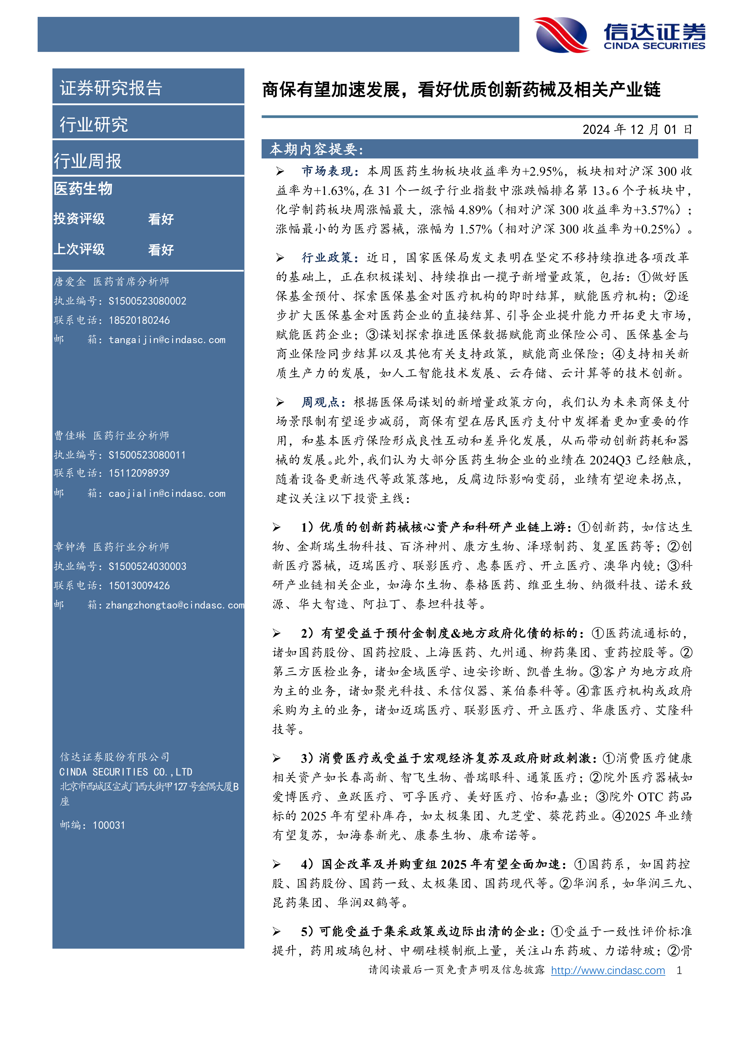 本报告基于对近期医药生物行业政策、市场表现及公司动态的综合分析,认为商业保险有望加速发展,并看好优质创新药械及相关产业链。报告建议投资者关注五大投资主线,同时需注意改革进度不及预期、销售不及预期、临床数据不及预期、集采降价幅度高于预期以及市场竞争加剧等风险因素。 报告数据主要来源于IFinD,并对部分个股的业绩和发展前景进行了简要分析,为投资者提供投资决策参考。 但投资者仍需进行独立判断,并承担相应的投资风险。