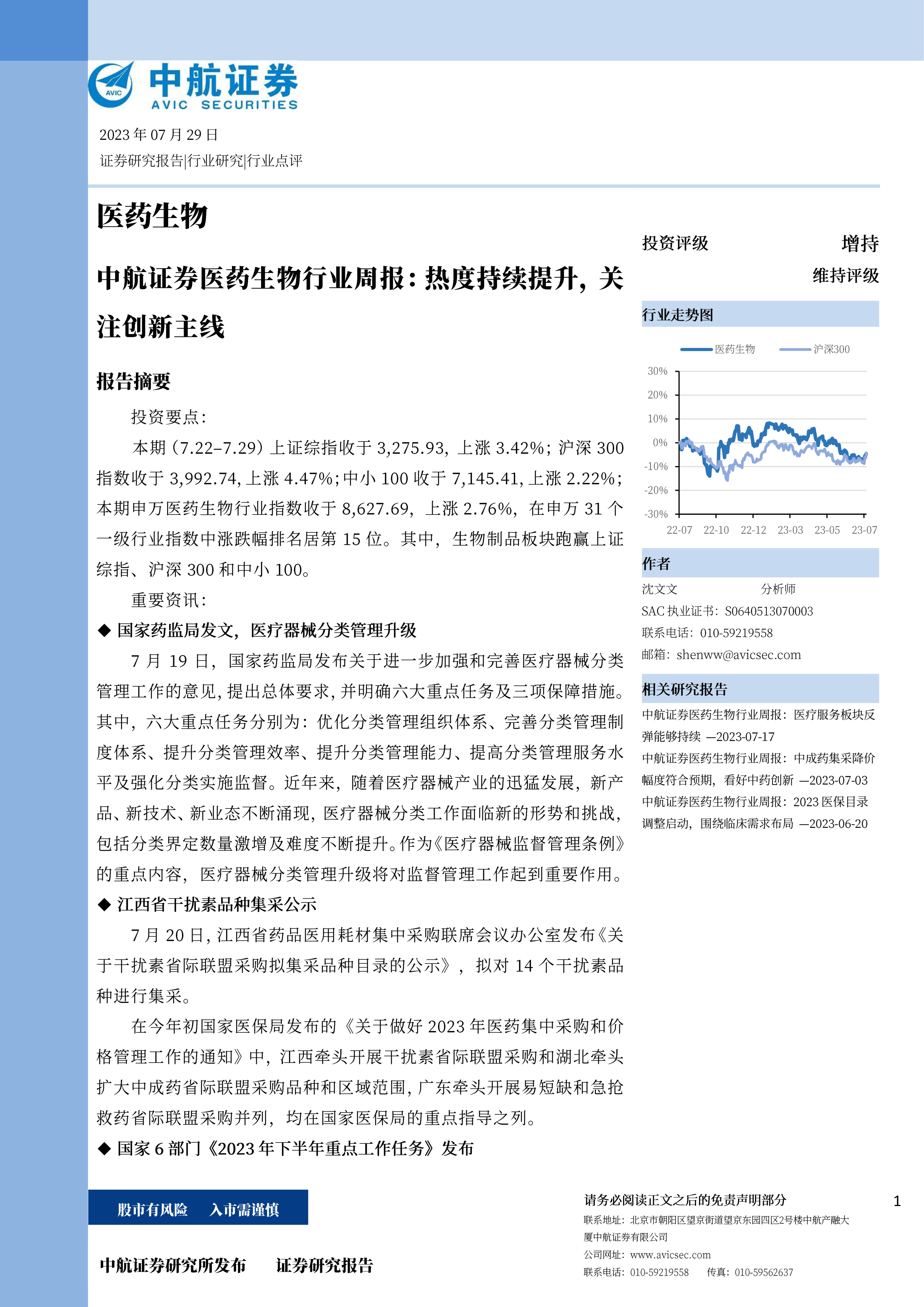 本期(7.22-7.29)上证综指收于3,275.93,上涨3.42%;沪深300指数收于3,992.74,上涨4.47%;中小100收于7,145.41,上涨2.22%;本期申万医药生物行业指数收于8,627.69,上涨2.76%,在申万31个一级行业指数中涨跌幅排名居第15位。其中,生物制品板块跑赢上证综指、沪深300和中小100。