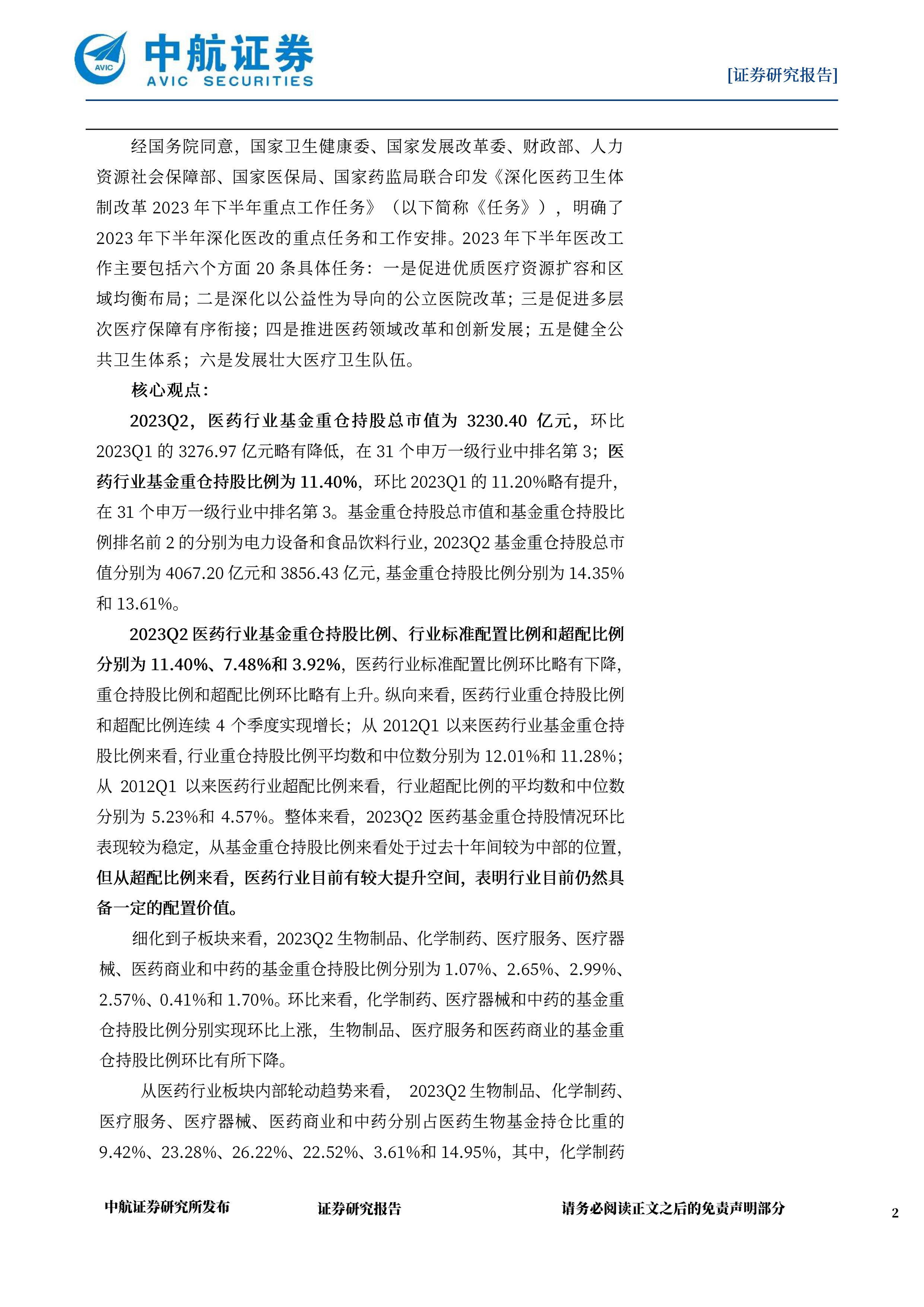 202302,医药行业基金重仓持股总市值为3230.40亿元,环比202301的3276.97亿元略有降低,在31个申万一级行业中排名第3;医药行业基金重仓持股比例为11.40%,环比2023Q1的11.20%略有提升,在31个申万一级行业中排名第3。基金重仓持股总市值和基金重仓持股比例排名前2的分别为电力设备和食品饮料行业,202302基金重仓持股总市值分别为4067.20亿元和3856.43亿元,基金重仓持股比例分别为14.35%和13.61%。