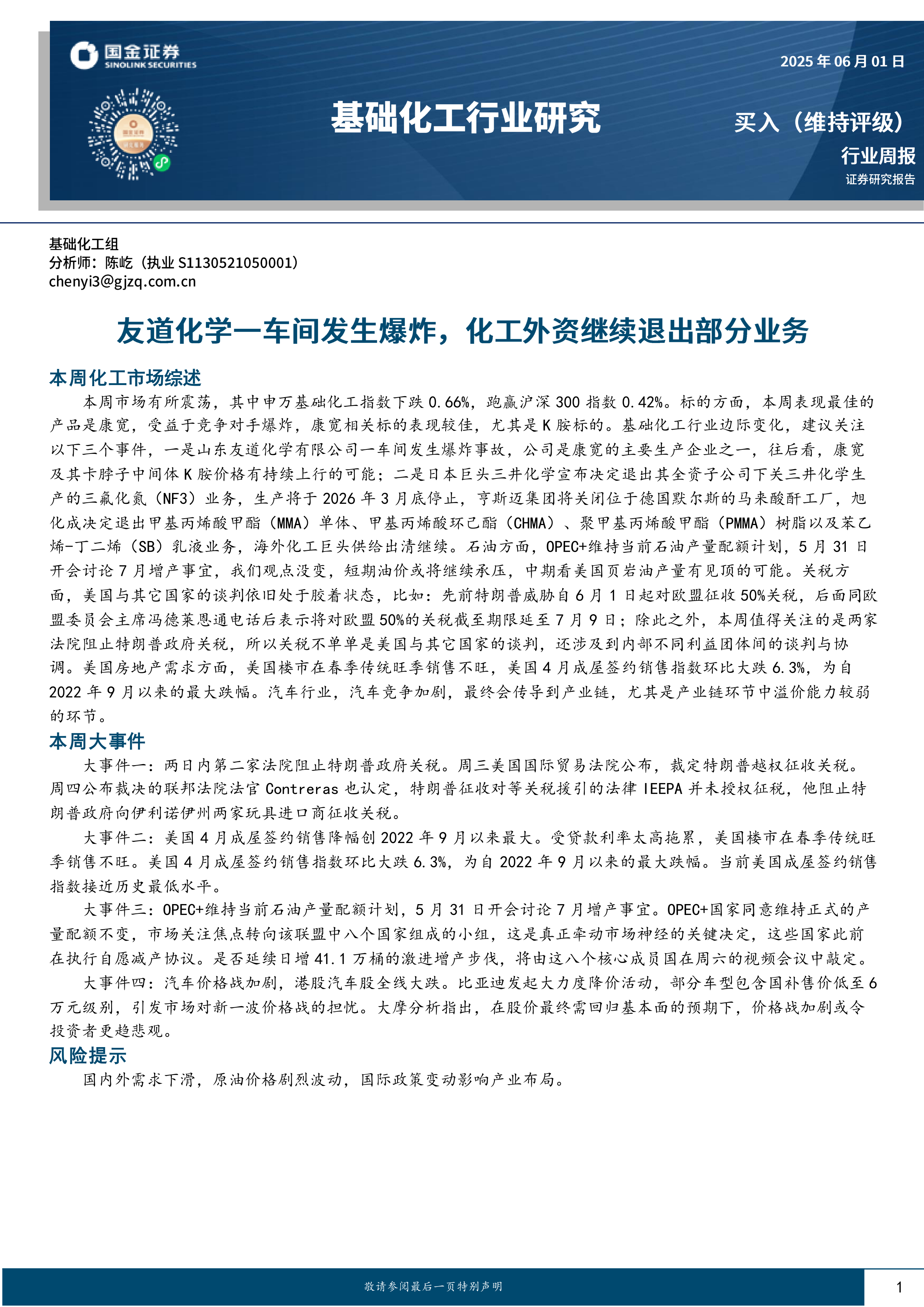 本周市场有所震荡,其中申万基础化工指数下跌0.66%,跑赢沪深300指数0.42%。标的方面,本周表现最佳的产品是康宽,受益于竞争对手爆炸,康宽相关标的表现较佳,尤其是K胺标的。基础化工行业边际变化,建议关注以下三个事件,一是山东友道化学有限公司一车间发生爆炸事故,公司是康宽的主要生产企业之一,往后看,康宽及其卡脖子中间体K胺价格有持续上行的可能;二是日本巨头三井化学宣布决定退出其全资子公司下关三井化学生产的三氟化氮(NF3)业务,生产将于2026年3月底停止,亨斯迈集团将关闭位于德国默尔斯的马来酸酐工厂,旭化成决定退出甲基丙烯酸甲酯(MMA)单体、甲基丙烯酸环己酯(CHMA)、聚甲基丙烯酸甲酯(PMMA)树脂以及苯乙烯-丁二烯(SB)乳液业务,海外化工巨头供给出清继续。石油方面,OPEC+维持当前石油产量配额计划,5月31日开会讨论7月增产事宜,我们观点没变,短期油价或将继续承压,中期看美国页岩油产量有见顶的可能。关税方面,美国与其它国家的谈判依旧处于胶着状态,比如:先前特朗普威胁自6月1日起对欧盟征收50%关税,后面同欧盟委员会主席冯德莱恩通电话后表示将对欧盟50%的关税截至期限延至7月9日;除此之外,本周值得关注的是两家法院阻止特朗普政府关税,所以关税不单单是美国与其它国家的谈判,还涉及到内部不同利益团体间的谈判与协调。美国房地产需求方面,美国楼市在春季传统旺季销售不旺,美国4月成屋签约销售指数环比大跌6.3%,为自2022年9月以来的最大跌幅。汽车行业,汽车竞争加剧,最终会传导到产业链,尤其是产业链环节中溢价能力较弱的环节。