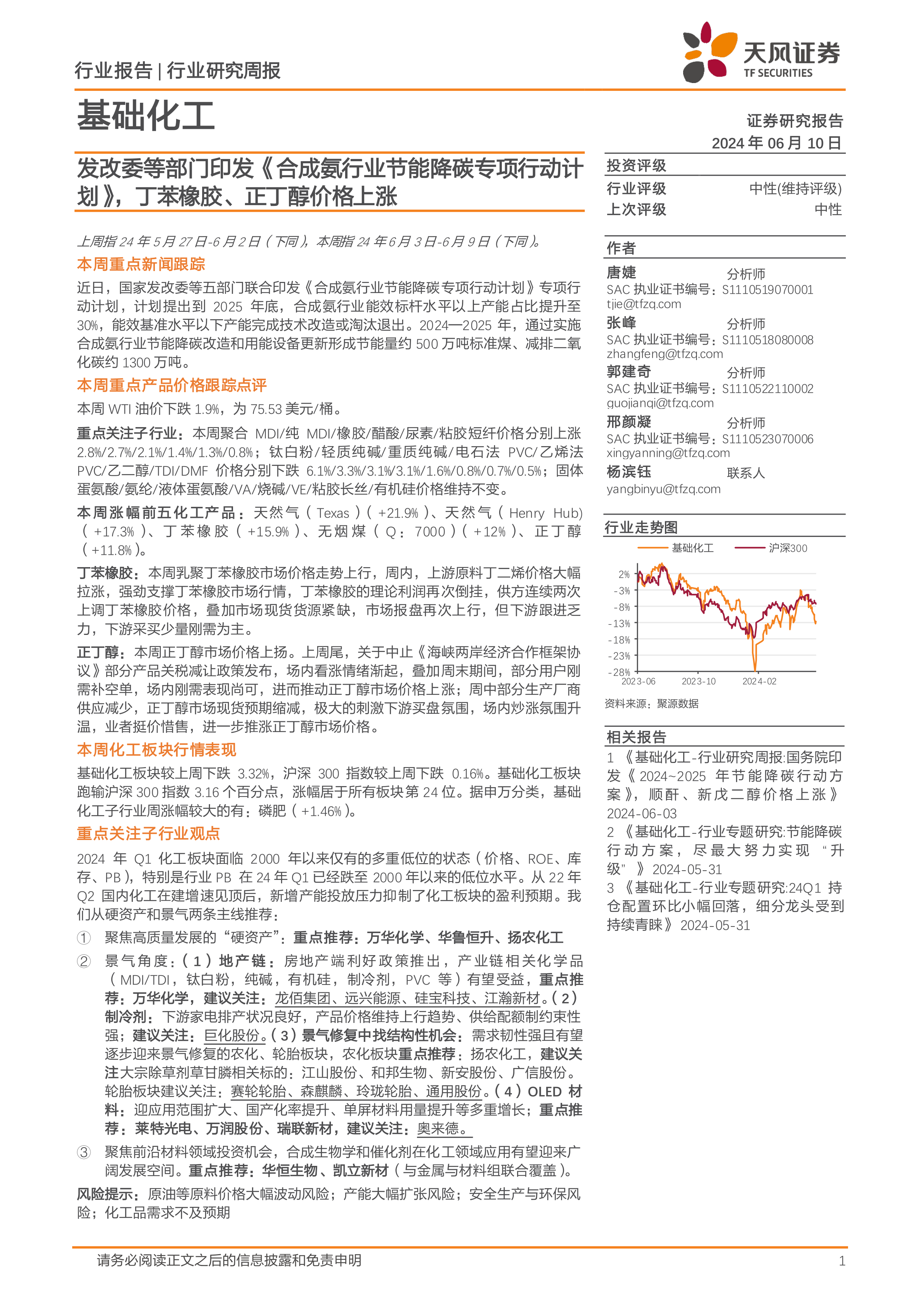 基础化工行业研究周报:发改委等部门印发《合成氨行业节能降碳专项行动计划》,丁苯橡胶、正丁醇价格上涨