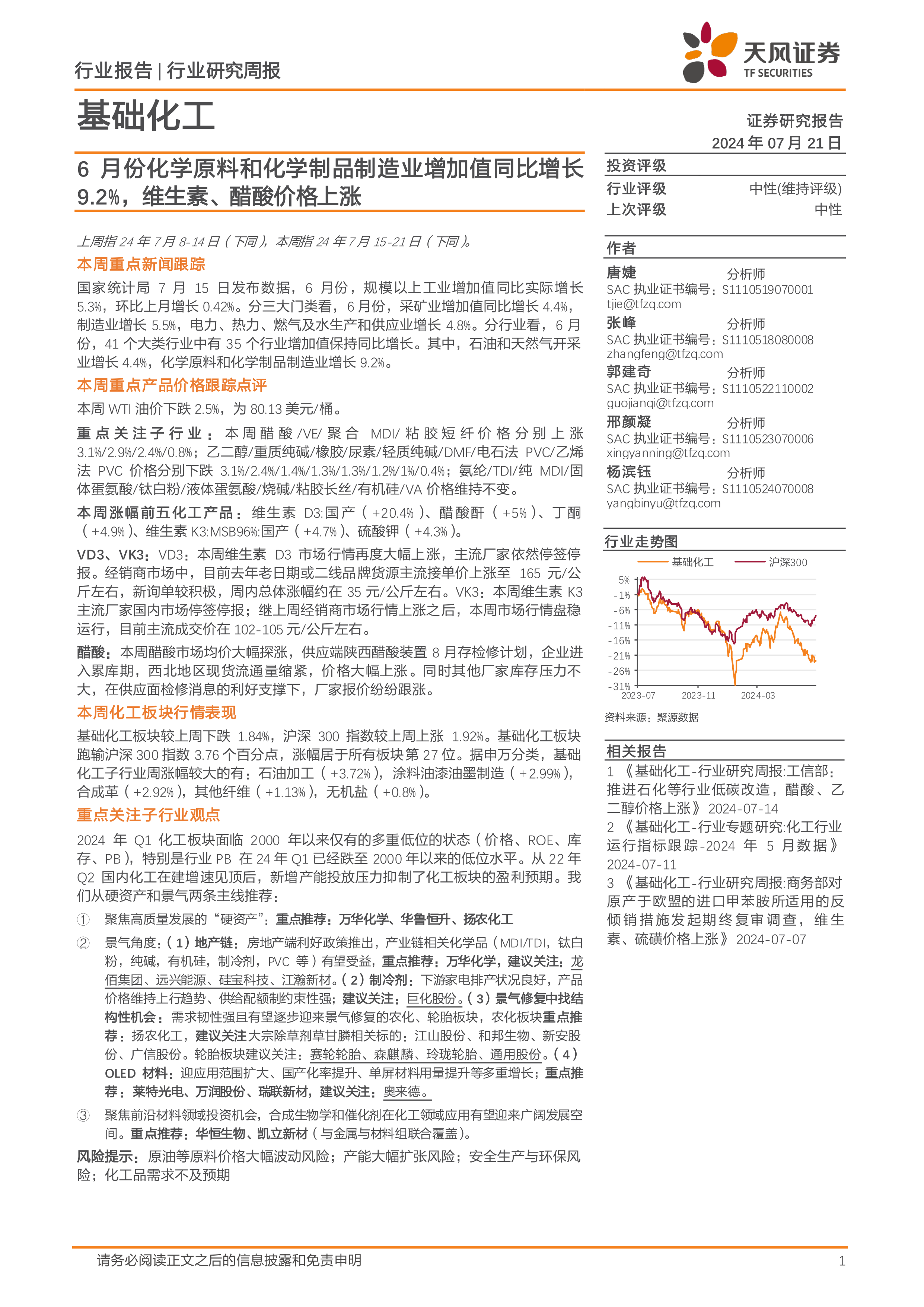 基础化工行业研究周报:6月份化学原料和化学制品制造业增加值同比增长9.2%,维生素、醋酸价格上涨