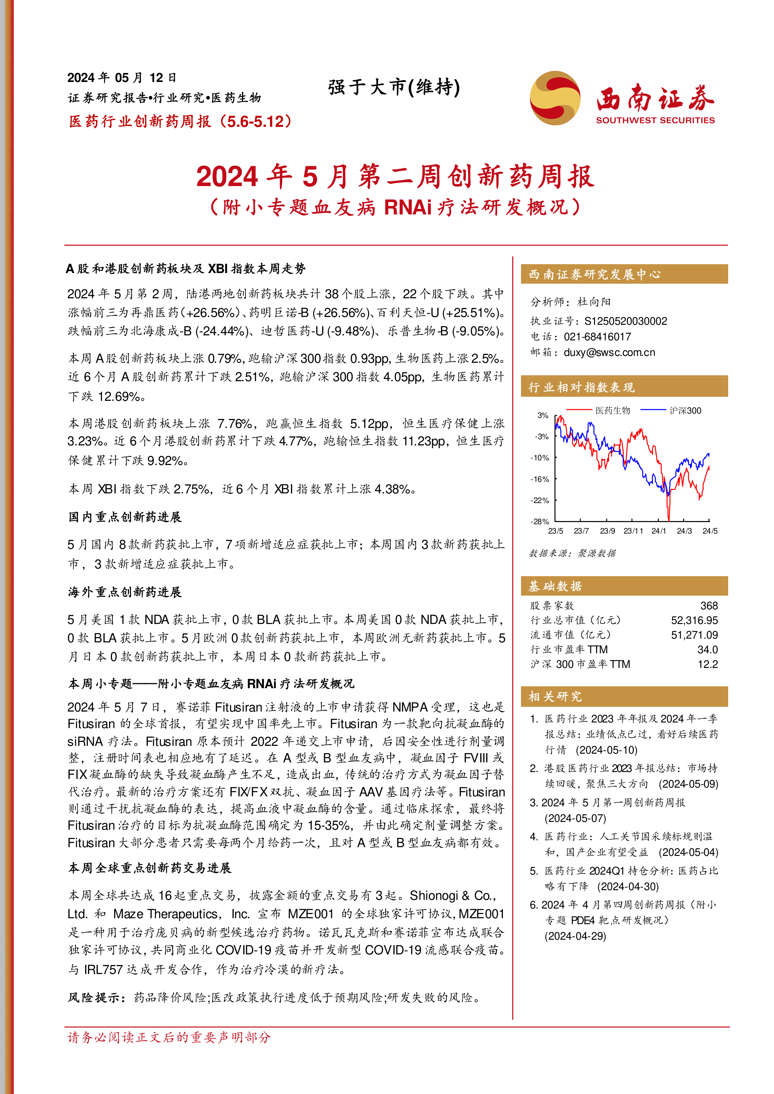 2024年5月第二周创新药周报(附小专题血友病RNAi疗法研发概况)