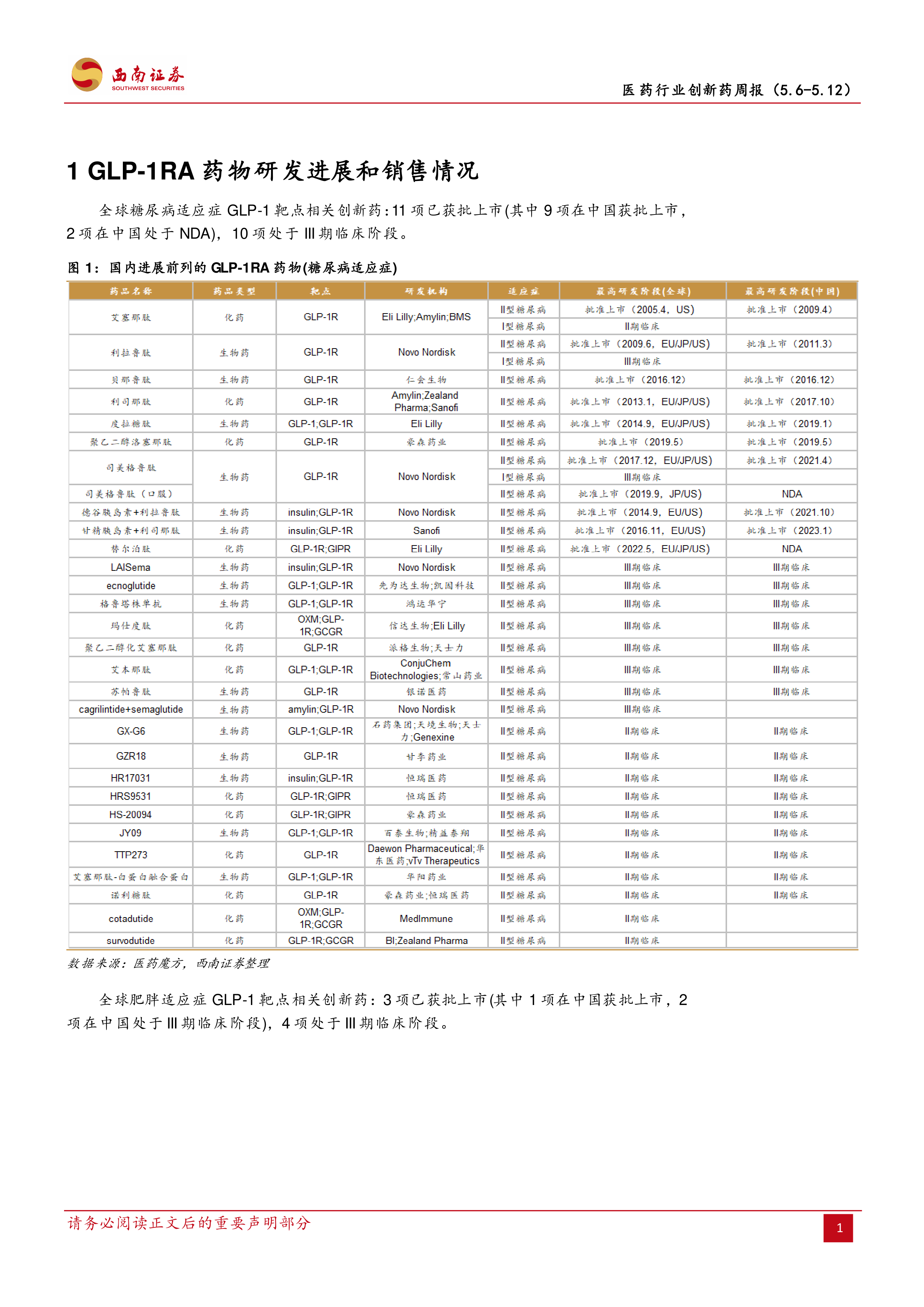 报告对GLP-1药物的研发进展和销售情况进行了分析,分别从糖尿病和肥胖适应症两个方面进行了阐述,并提供了相应的图表数据,包括全球销售额和国内医院销售数据。 这部分内容展现了GLP-1药物市场的竞争格局和发展趋势。