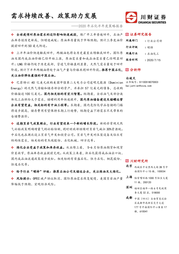 2020年石化半年度策略报告:需求持续改善、政策助力发展