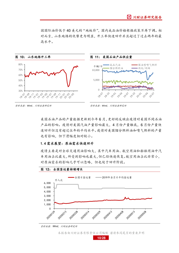 报告分析了疫情对全球原油需求的影响,指出随着各国“解禁”,疫情对原油需求的边际影响减弱,国际原油需求整体回升。报告通过分析美国需求变化,推断全球原油消费结构变化,并指出疫情对交通用油影响最大,但已快速恢复。