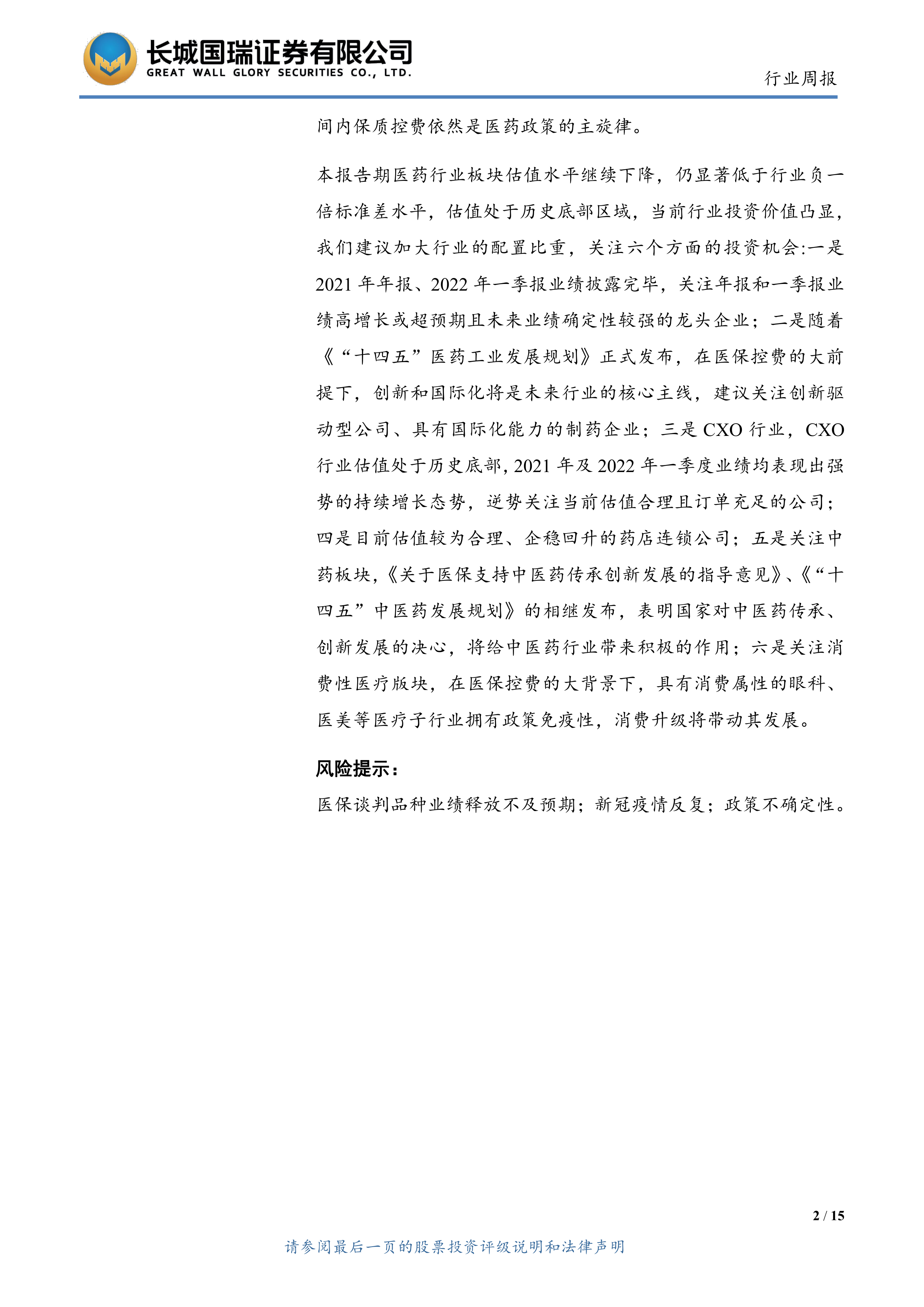 本报告期医药行业板块估值水平继续下降,仍显著低于行业负一倍标准差水平,估值处于历史底部区域,当前行业投资价值凸显,我们建议加大行业的配置比重,关注六个方面的投资机会:一是2021年年报、2022年一季报业绩披露完毕,关注年报和一季报业绩高增长或超预期且未来业绩确定性较强的龙头企业;二是随着《“十四五”医药工业发展规划》正式发布,在医保控费的大前提下,创新和国际化将是未来行业的核心主线,建议关注创新驱动型公司、具有国际化能力的制药企业;三是CXO行业,CXO行业估值处于历史底部,2021年及2022年一季度业绩均表现出强势的持续增长态势,逆势关注当前估值合理且订单充足的公司;四是目前估值较为合理、企稳回升的药店连锁公司;五是关注中药板块,《关于医保支持中医药传承创新发展的指导意见》、《“十四五”中医药发展规划》的相继发布,表明国家对中医药传承、创新发展的决心,将给中医药行业带来积极的作用;六是关注消费性医疗版块,在医保控费的大背景下,具有消费属性的眼科、医美等医疗子行业拥有政策免疫性,消费升级将带动其发展。