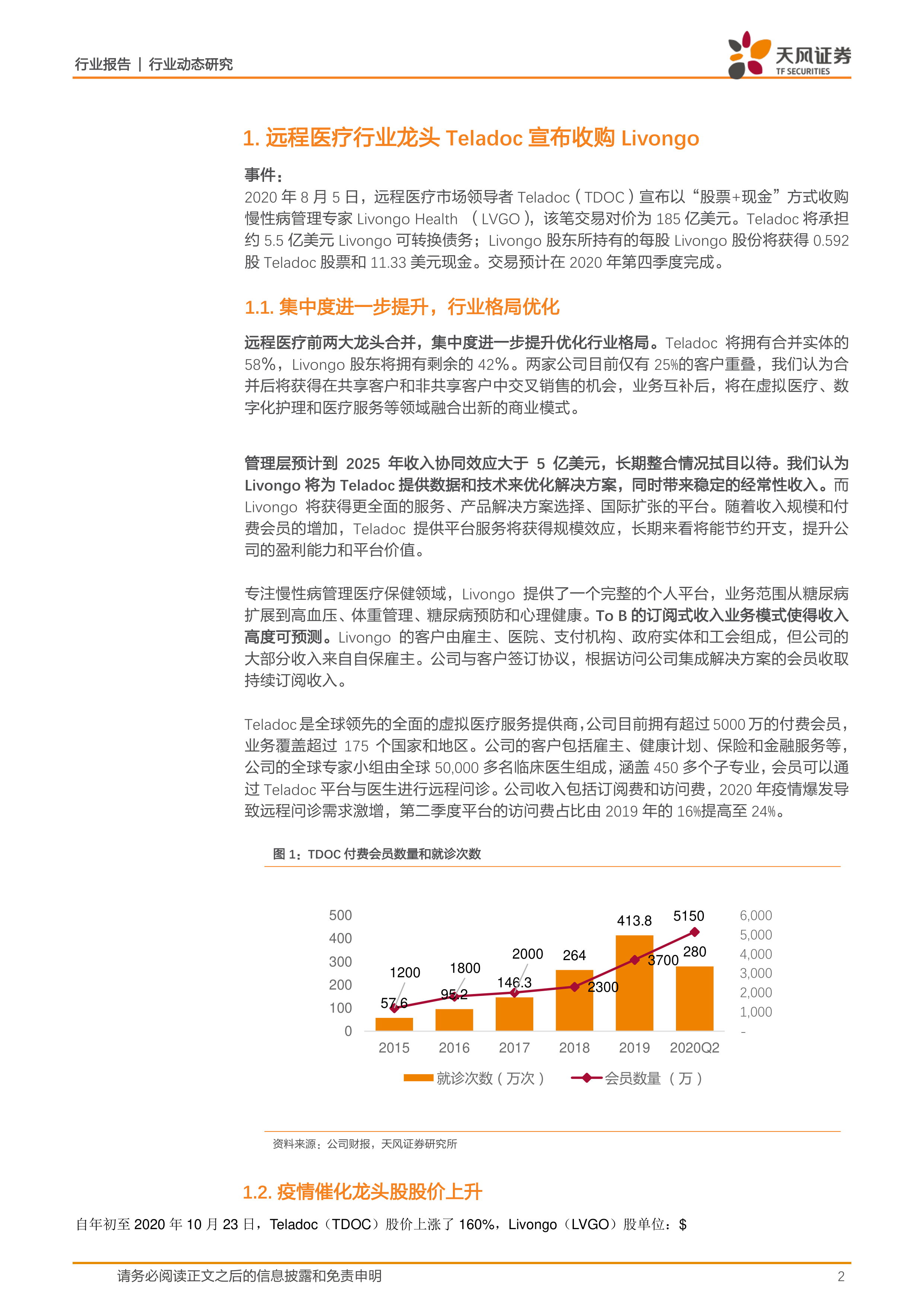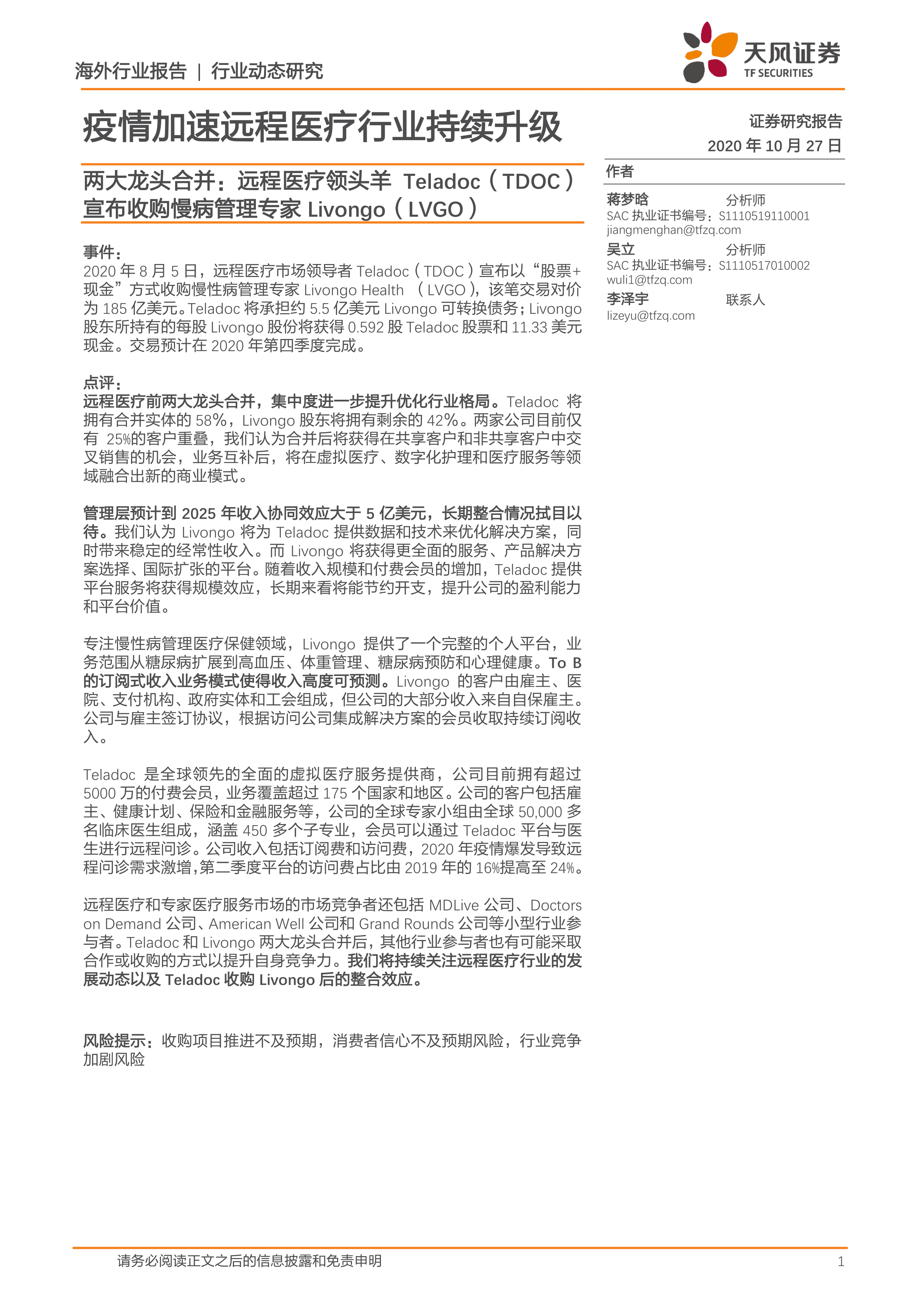 疫情加速远程医疗行业持续升级:两大龙头合并:远程医疗领头羊Teladoc(TDOC)宣布收购慢病管理专家Livongo(LVGO)