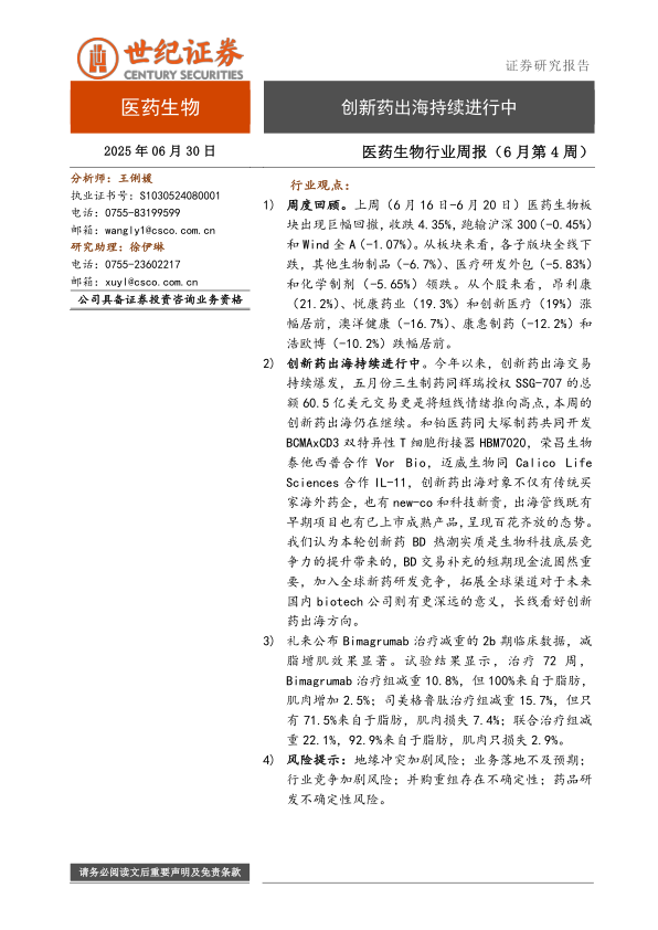 本报告对2025年6月医药生物行业进行了周度回顾和分析。报告指出,创新药出海持续进行中,多家中国生物科技公司与国际药企达成合作,展现了中国创新药的竞争力。然而,医药生物板块市场波动较大,个股表现分化明显,投资者需谨慎投资,关注相关风险。报告还详细介绍了本周医药行业的重要事件和公司公告,为投资者提供了重要的市场信息。 未来需持续关注创新药出海的进展,以及国内政策对医药行业的影响,以便更好地把握市场机遇和风险。